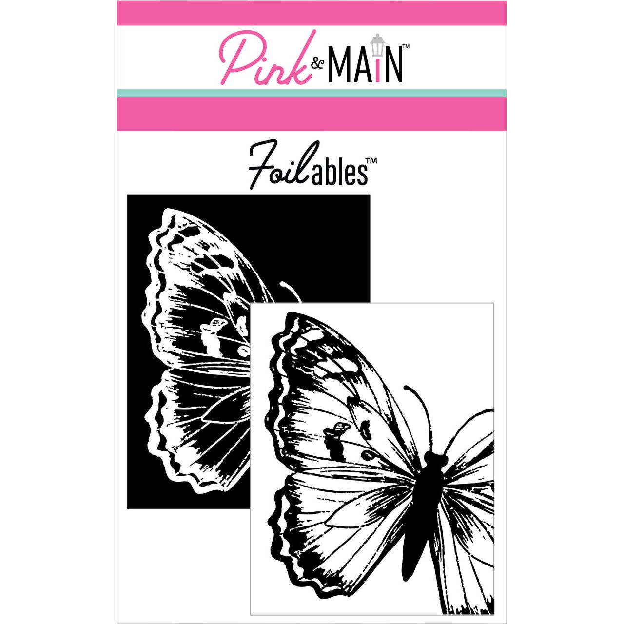 Pink and Main Sketched Butterfly Foilables Panels is an A2-sized set that includes 8 sheets, 4 x 5.25 inches, with four positive and four negative versions of a finely detailed sketched butterfly. Use with CheerFoil and a toner foiling machine or laminator to add elegant, shimmering accents to your projects.