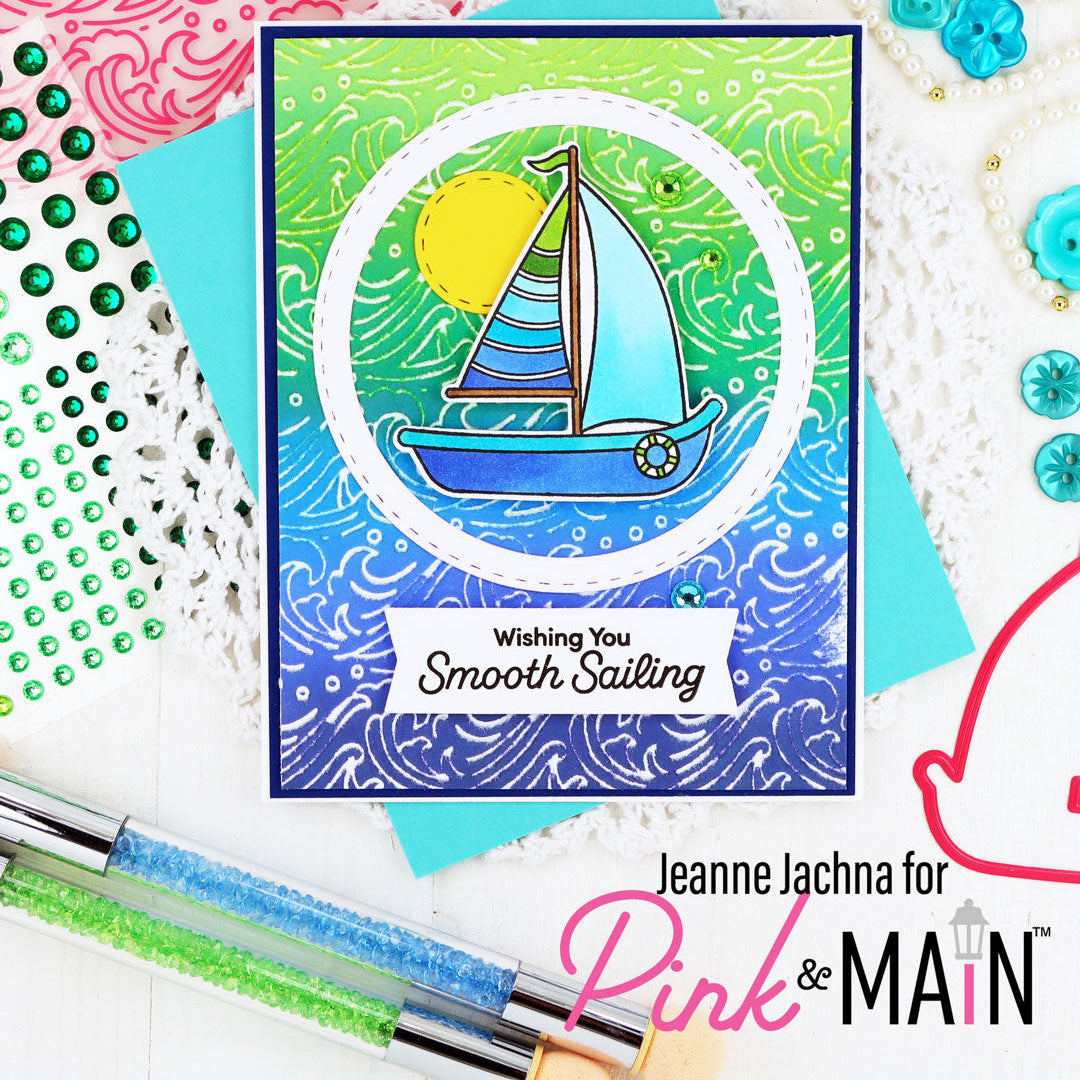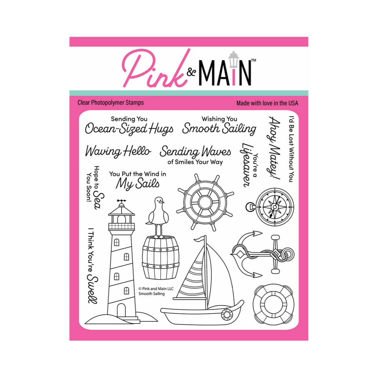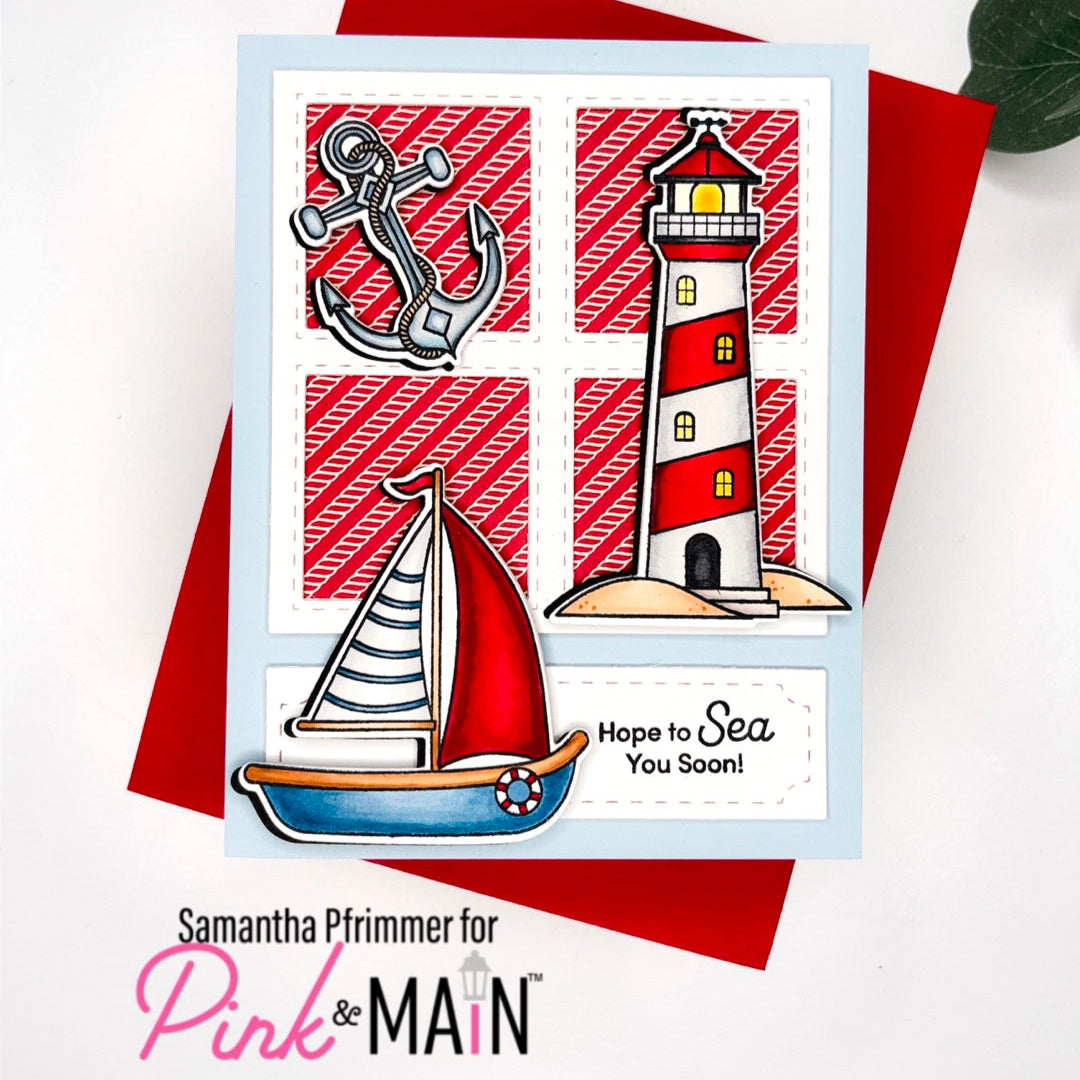 The Pink and Main Smooth Sailing Clear Stamps is a 6x6 inch set full of nautical charm. It features detailed images including a sailboat, lighthouse, anchor, ship wheel, life preserver, compass, and a barrel with a seagull perched on top. The set also includes 10 coordinating sentiments to help complete your maritime scenes. Pairs with the Smooth Sailing Dies PNM765, sold separately. Perfect for summer cards, travel themes, and ocean-inspired projects.