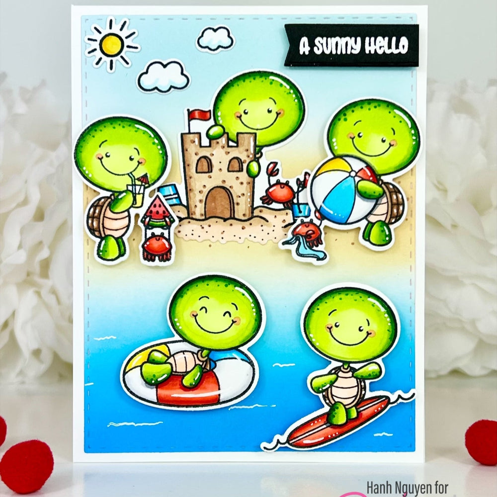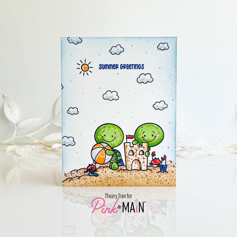 The Pink and Main Spe-Shell Day Clear Stamps is a 4x6 inch set featuring the adventures of a cheerful little turtle enjoying the perfect beach day. Whether building a sandcastle, surfing, floating, having a beverage with a crab friend, or playing with a beach ball, this set brings sunny charm to your summer projects. It also includes clouds, sunglasses, a sunshine, and coordinating sentiments to complete your scene. Pairs with the Spe-Shell Day Dies PNM759, sold separately.