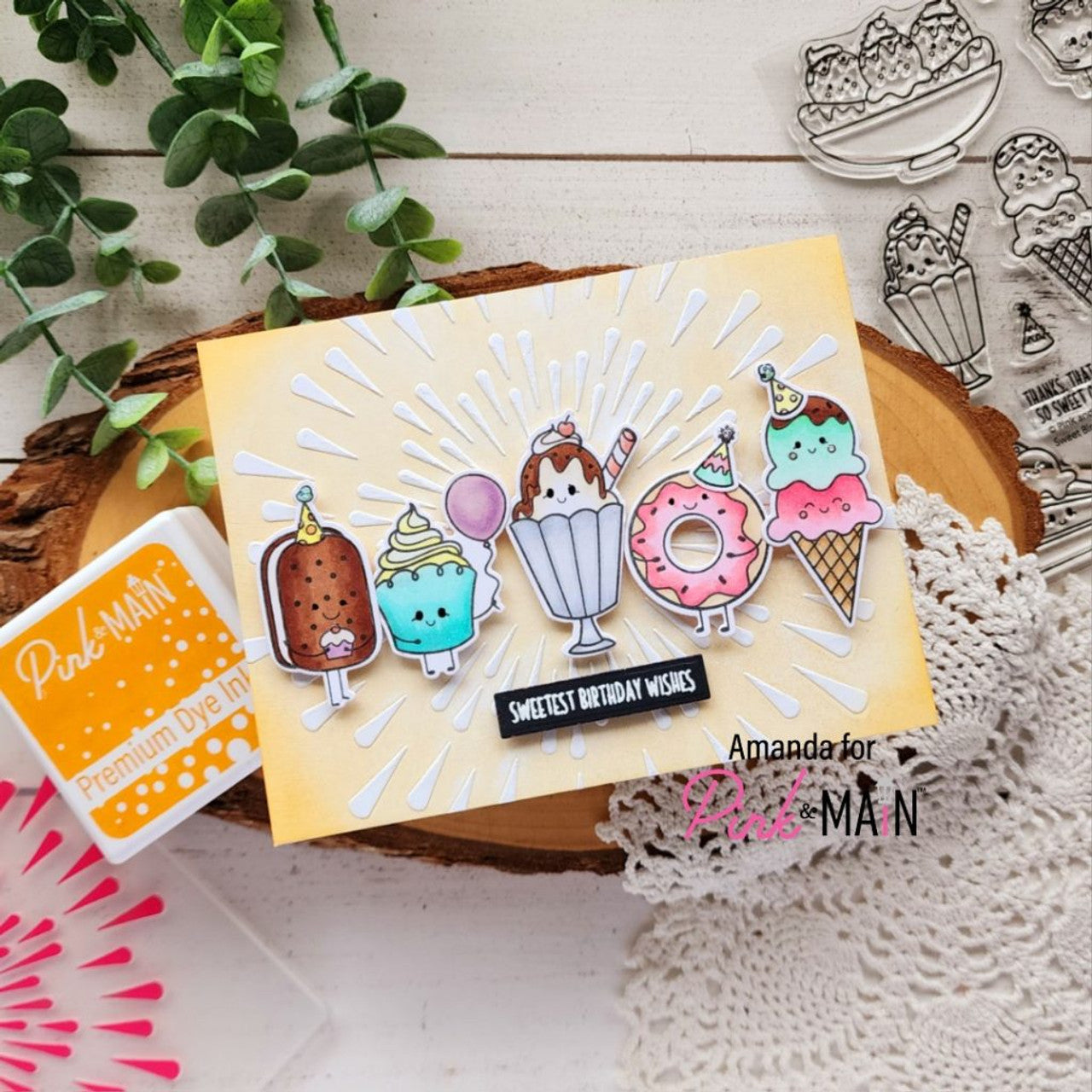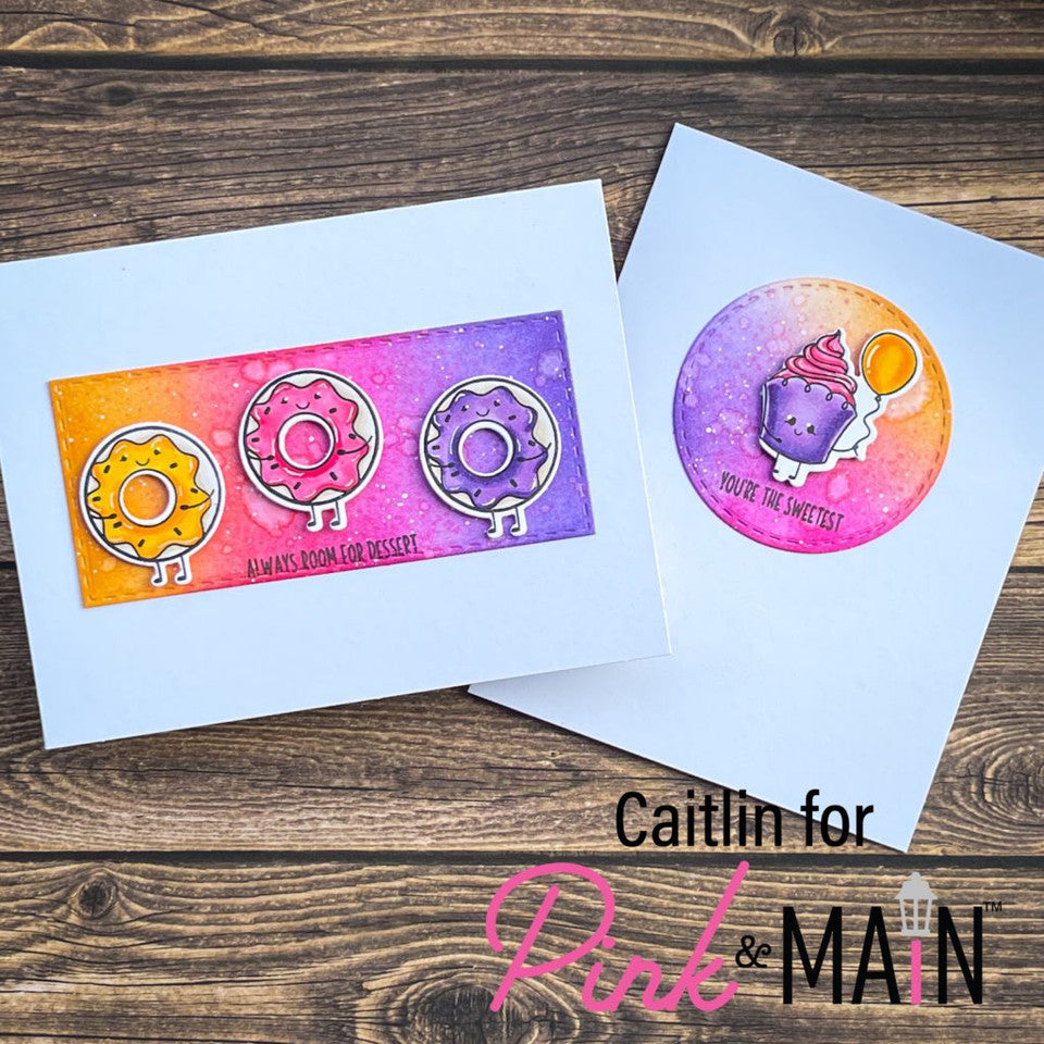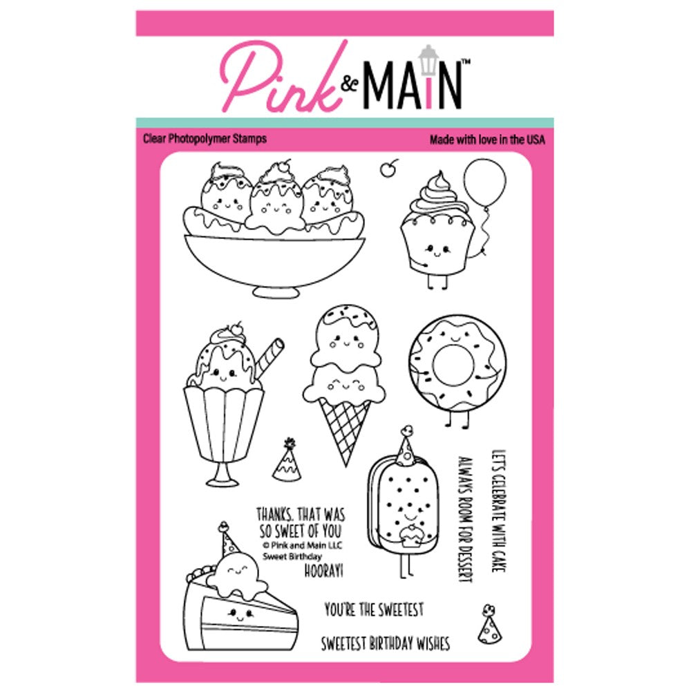 The Pink and Main Sweet Birthday Stamp Set is a 4x6 inch set that features a variety of sweet treats, including ice cream, cupcakes, and other confectionary delights. This stamp set is perfect for creating fun and playful birthday-themed cards, invitations, and other paper crafts.