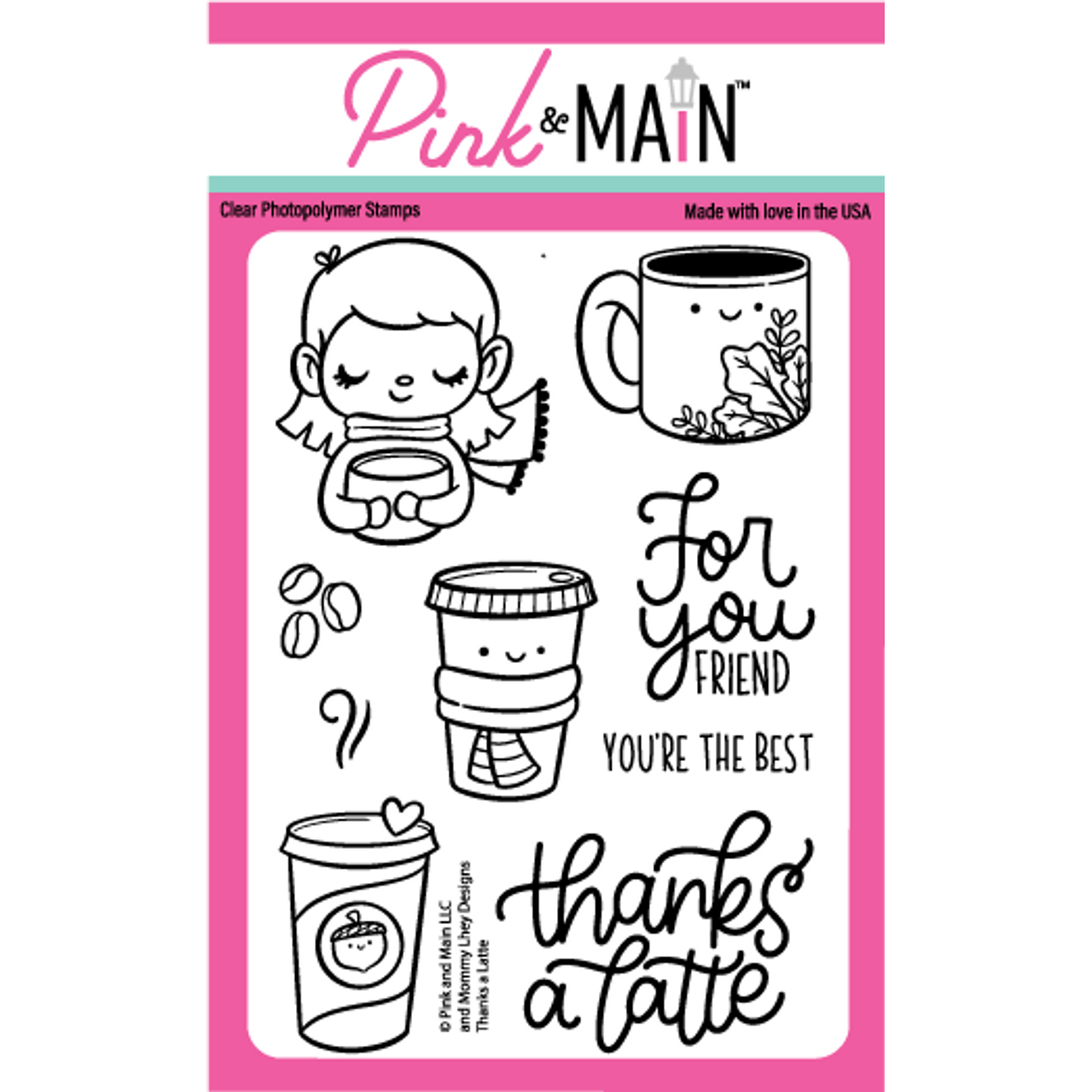 Introducing the Pink and Main Thanks A Latte Clear Stamps, a delightful collection perfect for the coffee enthusiast in your world. This ideal 4x6 inch stamp set features a range of images tailored to coffee aficionados, including a cheerful woman with a generously sized cup of coffee, various coffee mugs, to-go cups, aromatic coffee beans, and a collection of enjoyable sentiments. For seamless coordination, corresponding dies are available for this set, enhancing your crafting experience.