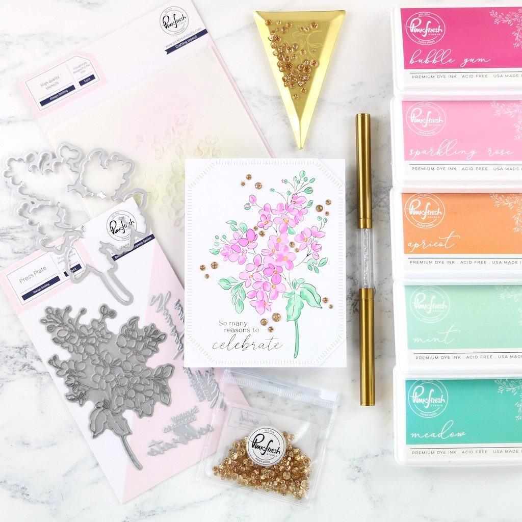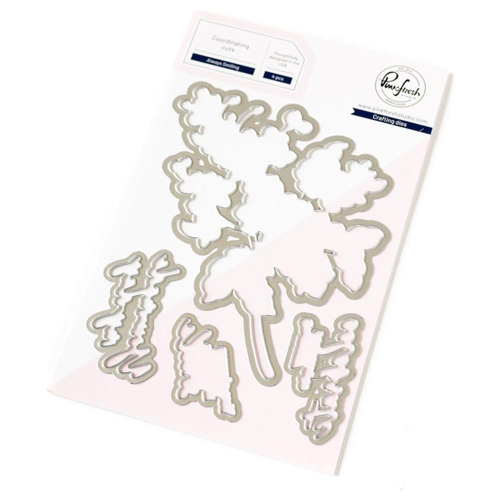Indulge in the luxurious Pinkfresh Studio Always Smiling Dies. This 4-piece set flawlessly coordinates with the Always Smiling stamp set (258924), Always Smiling press plate (259224) and Always Smiling stencil set (259124) for a perfect match. Cut out the beautifully detailed branch image with a delicate white border, and trim the large scripted sentiment with ease.