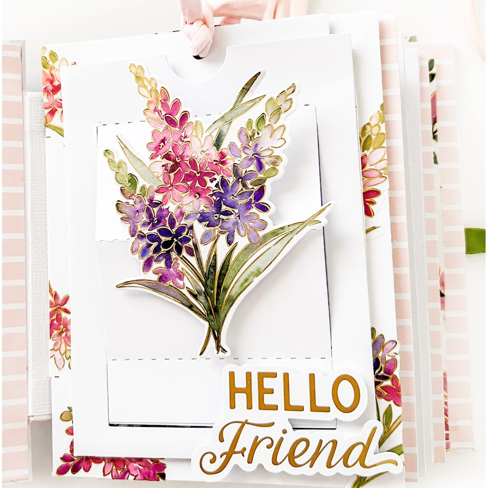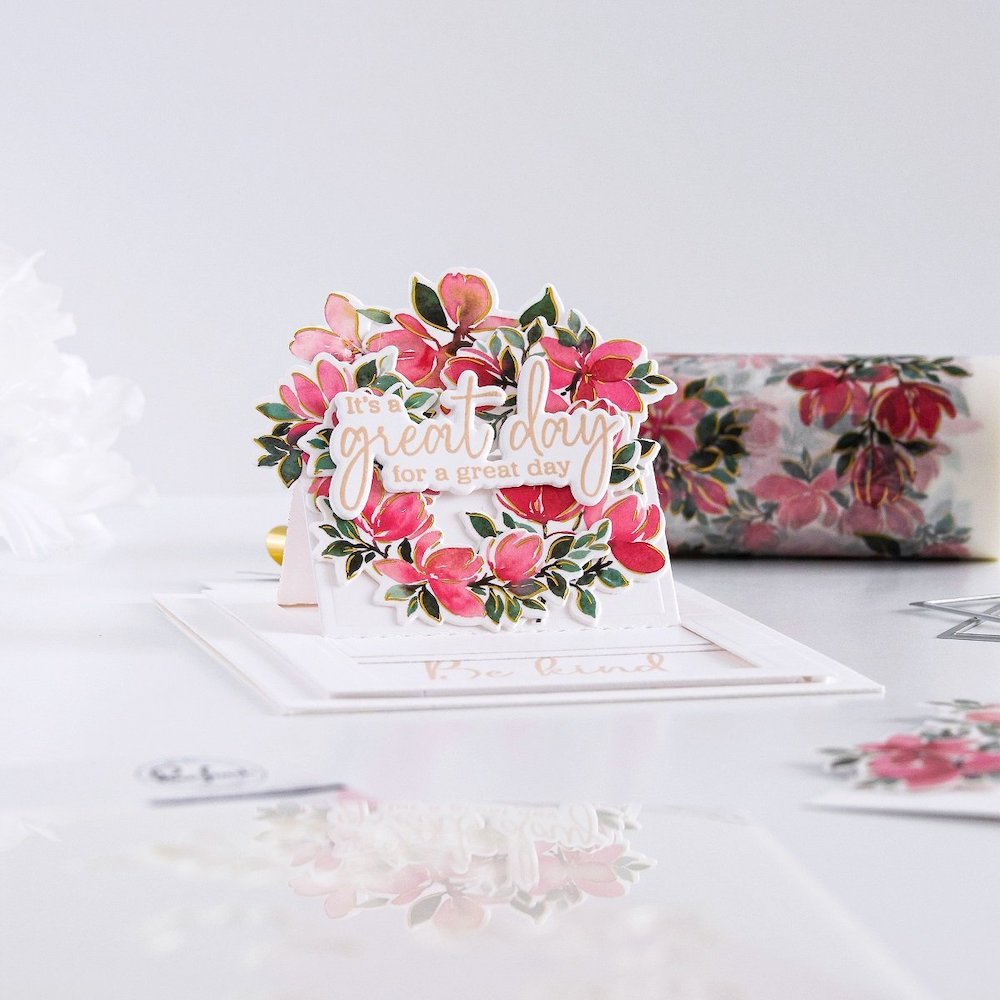 One of the unique features of this stamp set is that it includes all the beautiful magnolia bunches on one stamp, making it a perfect match for the 1-piece coordinating die. The 1-piece stamp is slightly larger than 8.5 inches, and it will likely fit at an angle in a standard stamping platform. Alternatively, you can use a larger stamping platform, or you can follow the hinged lid method demonstrated in PinkFresh's Tips and Tricks section on their YouTube channel.