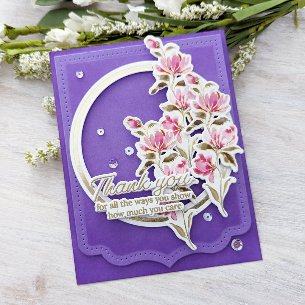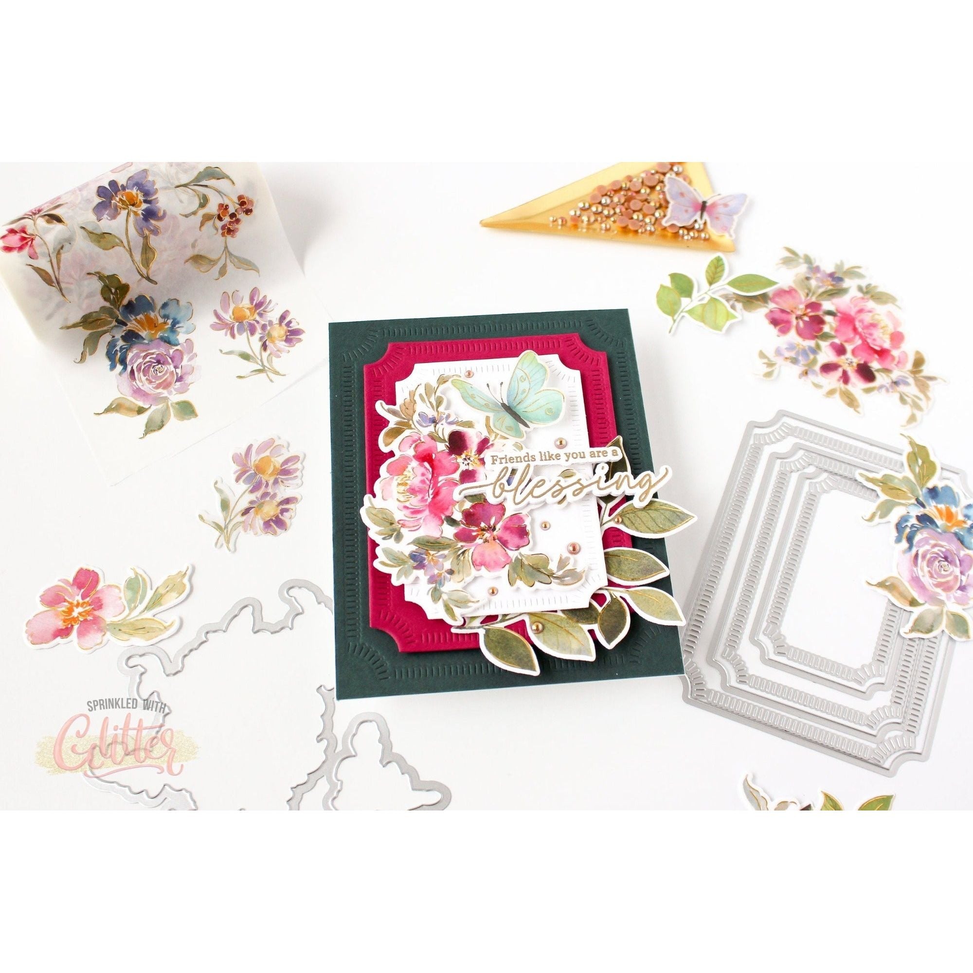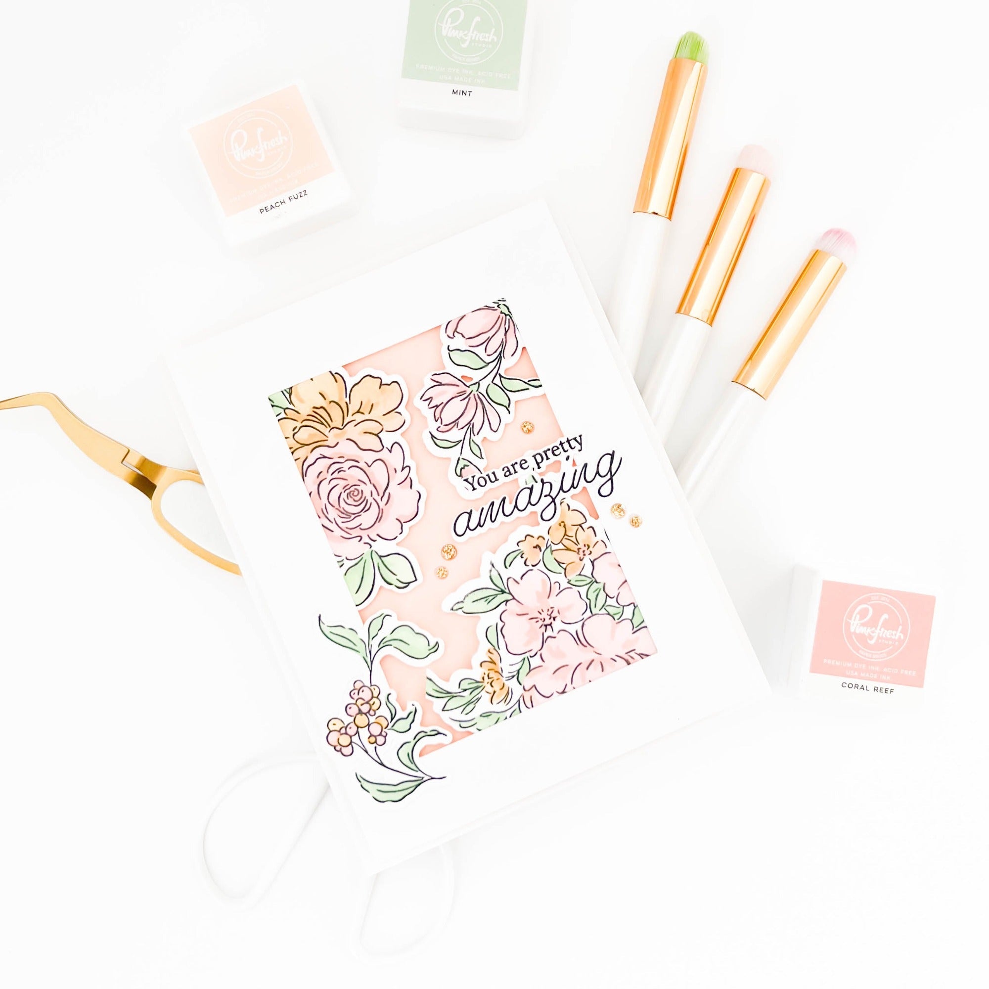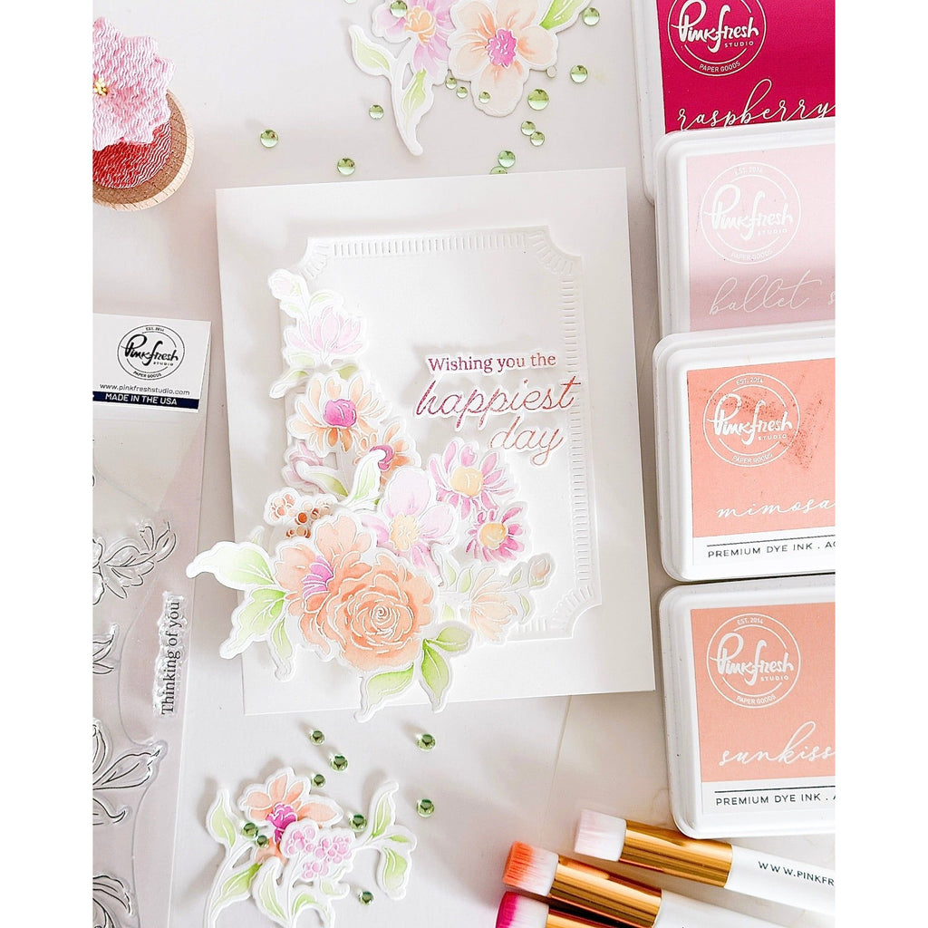 This 4 x 12 photopolymer clear stamp set, designed by expert Manushree Mishra, is designed to work seamlessly with the Artsy Floral die (240824), Artsy Floral layering stencils (240924), and Artsy Floral washi tape (241024). This innovative stamp features all of the floral clusters on one stamp, making it the perfect match for the 1-piece coordinating die. Measuring 8.5 inches long, this stamp should fit into any standard stamping platform for easy use. If it doesn't, simply try angling it or using the hinged lid method, as featured on Pinkfresh Studio's YouTube channel in the Tips and Tricks section. Use detail black ink or heat emboss for a touch of shine, and color in the floral images with your preferred medium. You can also ink blend using the coordinating layering stencils, or use the outline alone for a modern look. These versatile clusters are perfect for various coloring techniques such as The following sentiments are included in the stamp set:
