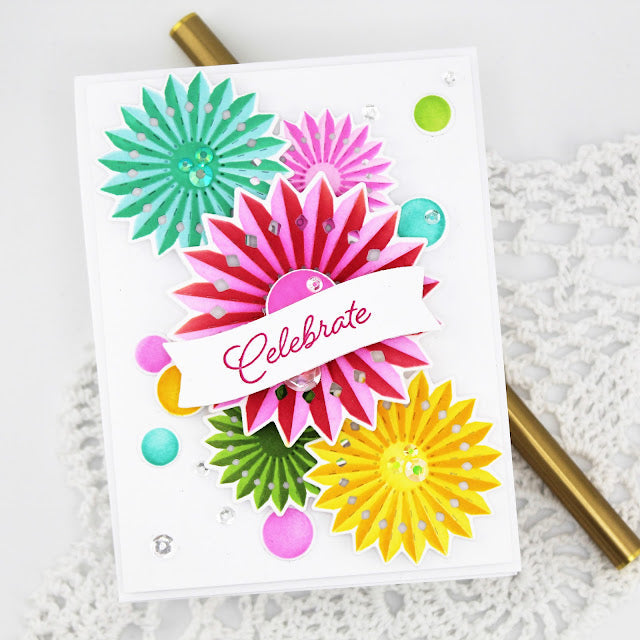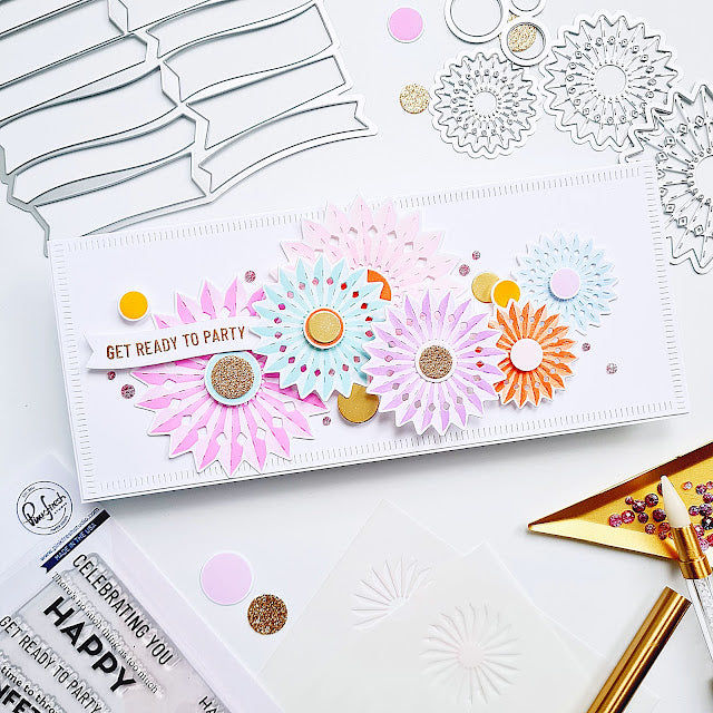 The PinkFresh Studio Basic Banners Celebrate Clear Stamp is a versatile 4 x 6 photopolymer clear stamp set designed by Kaitlin Sheaffer, which is perfect for all your birthday sentiment needs. This stamp set includes 12 different birthday-themed sentiments that can be stamped all at once, which can then be trimmed down with a paper trimmer or used with the coordinating banner die.