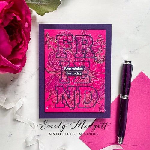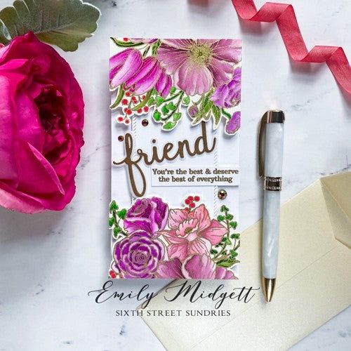 4 x 6 inch photopolymer clear stamp set designed by Emily Midgett. Made to coordinate with the Best of Everything Floral layering stencil set. Available for purchase separately.