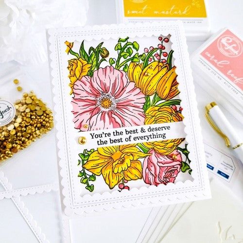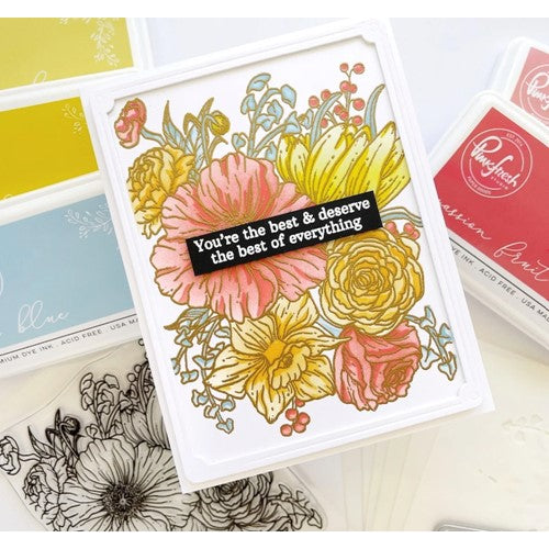 This stunning outline floral background image is perfectly sized to make a bold statement on an A2 size card front! Easily ink blend the 6 different layers with the coordinating set of stencils in PinkFresh's premium dye inks, or color them with your favorite medium. The florals and leaves are perfect for all types of coloring; including watercolor, alcohol and brush markers, colored pencils and no-line coloring. Finish off with one of the lovely simple sentiments included!