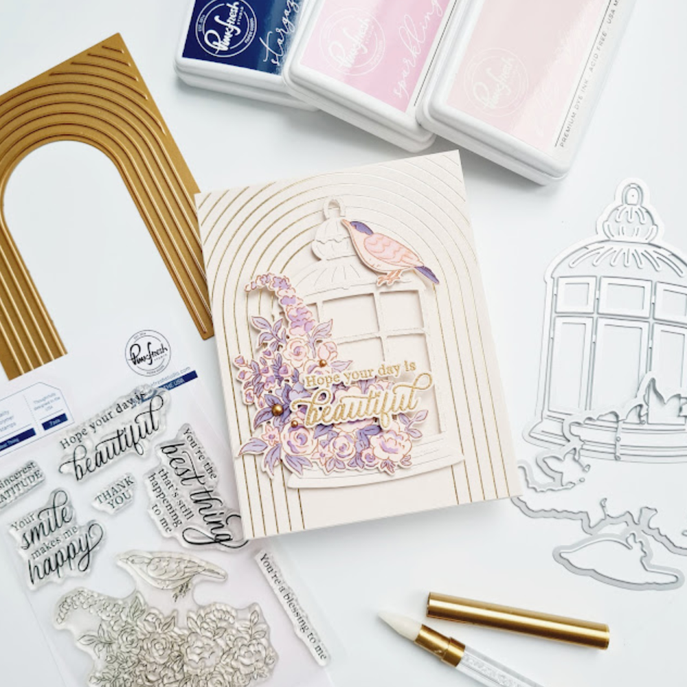 With this set, crafters can easily create whimsical scenes featuring the exquisite florals and charming bird included in the stamps. The birdcage, which is part of the stencil and die set, can be used to enhance the corner of a frame or other designs. The florals and bird are cleverly combined into a single stamp, ensuring effortless alignment with the coordinating layering stencils and 1-piece die.