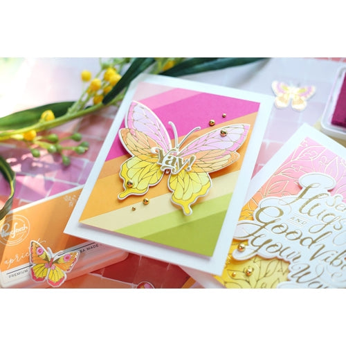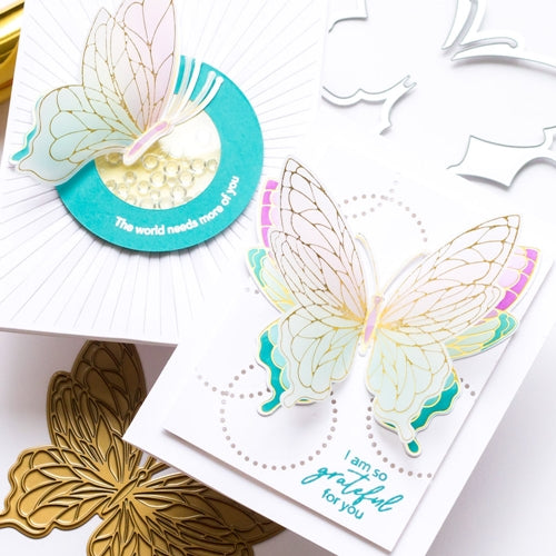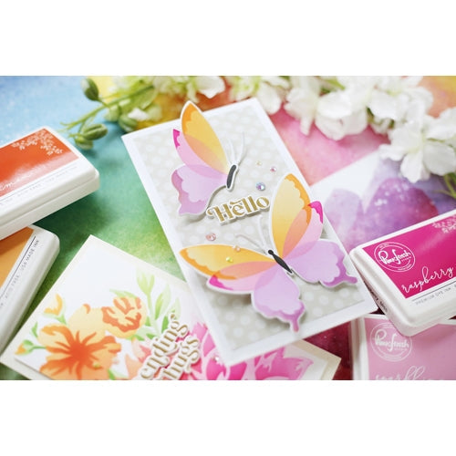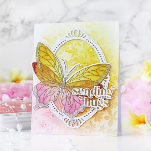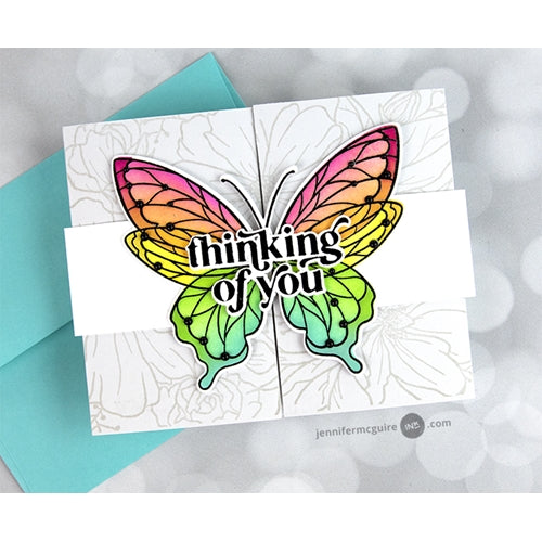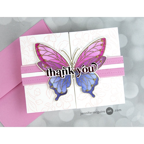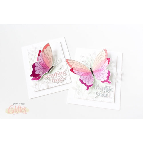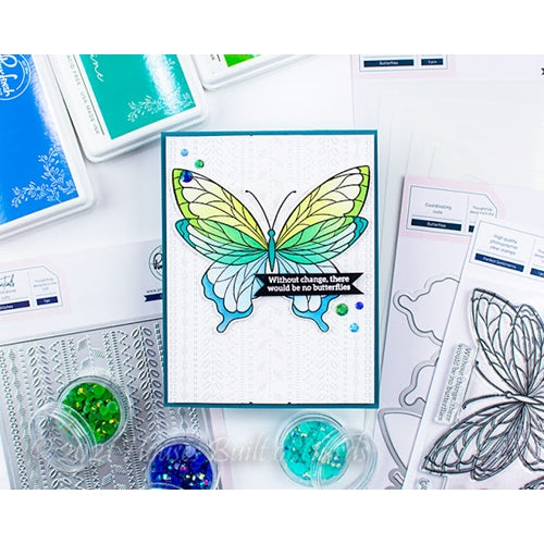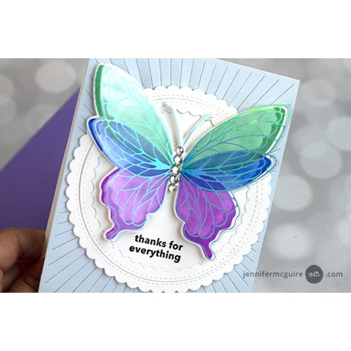 5 piece layering stencil set made to coordinate with the Butterflies stamp set and Butterflies die. There is a separate stencil for each layer, with guidelines on each stencil for perfect alignment every time. Use them without the stamped image for a soft, no-line coloring feel. Use the coordinating stamp to add more detail to the image by stamping in detail black, or heat embossing in gold.