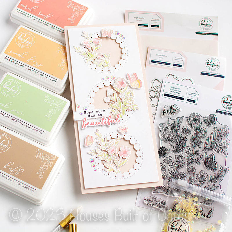 Introducing the PinkFresh Studio Butterfly Garden Clear Stamp Set! Designed by Cassidy Demkov, this 4 x 6 inch photopolymer clear stamp set is a must-have for all your crafting projects.