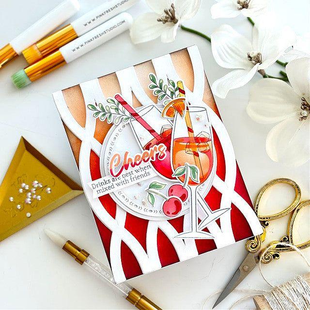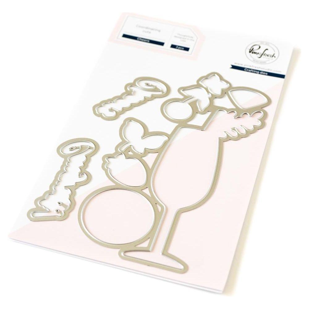 This 3-piece die set works perfectly with the Cheers stamp set (149122), Cheers press plate (242024), and Cheers stencil set (149322). One die precisely cuts around the Cheers drink and elements, leaving a small white border around each one. Additionally, there are dies specifically designed for the two scripted sentiments found on the stamp set.