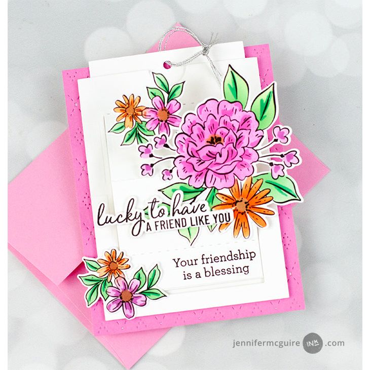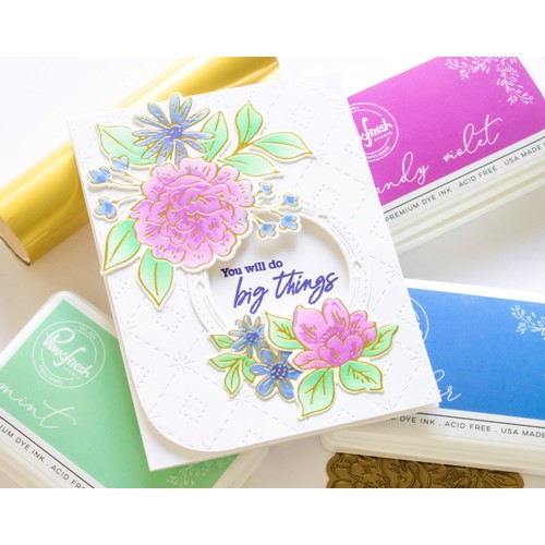 Create a stunning, letterpress feel to all your projects with a Pinkfresh feel using PinkFresh Studio’s beautiful hot foil plates! Designed to work in any standard hot foil system, be sure to follow the instructions in your manual for a standard hot foil plate. Once foiled, the beautiful floral clusters are perfect for all types of coloring; including watercolor, alcohol and brush markers, colored pencils and no-line coloring. Combine with the coordinating Dreamy Floral layering stencil set to ink blend the images with all 48 shades of PinkFresh Studio premium dye inks. Use the coordinating Dreamy Floral die to cut out the image.