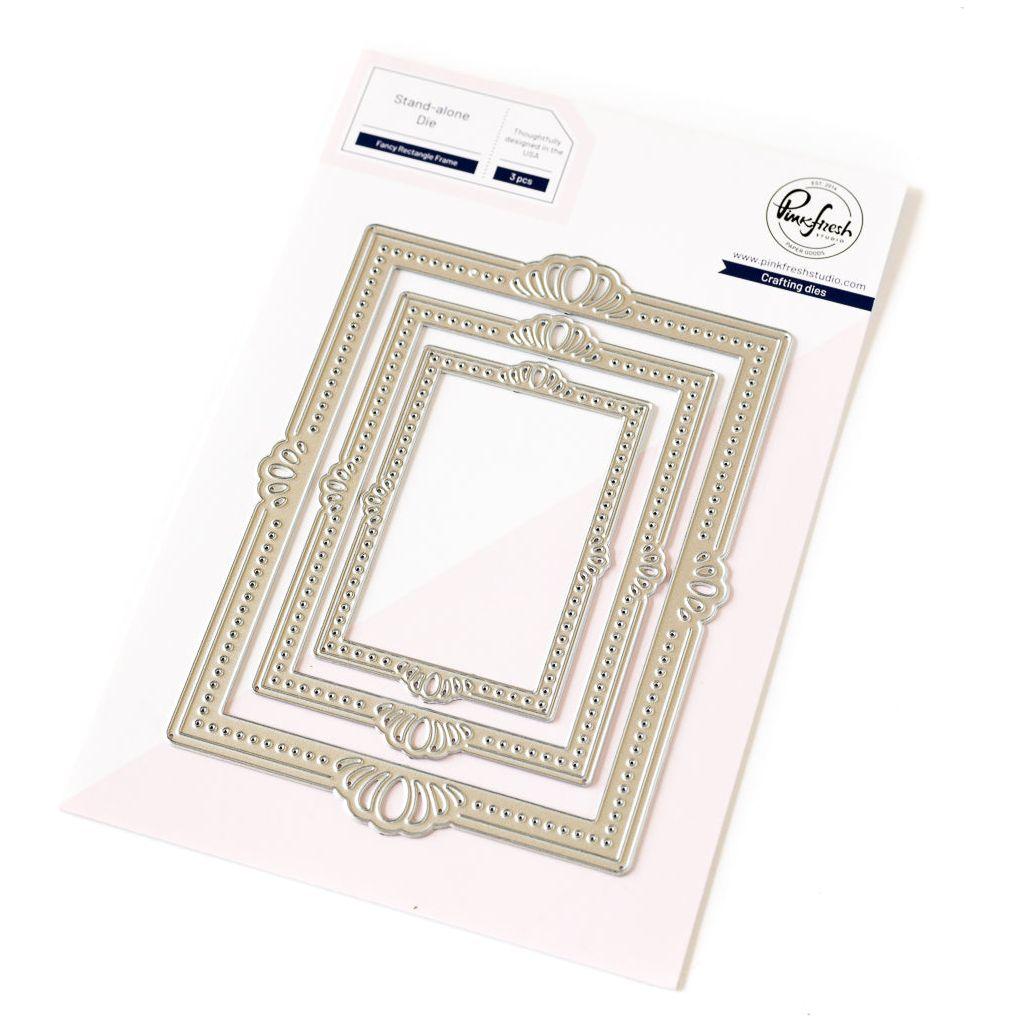 Craft beautiful and intricate designs with Pinkfresh Studio's Fancy Rectangle Frame Dies. This 3-piece set features three different sizes with detailed edges. Perfect for adding layers to your cards or framing photos in your scrapbook layouts. Essential for any crafting project.