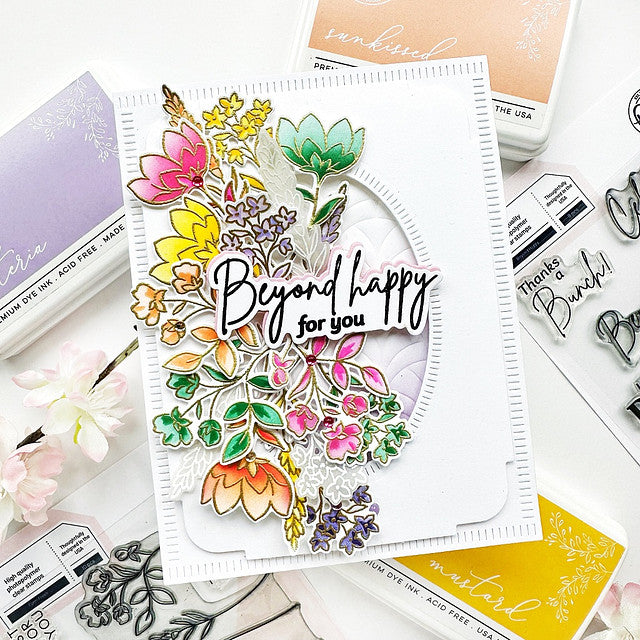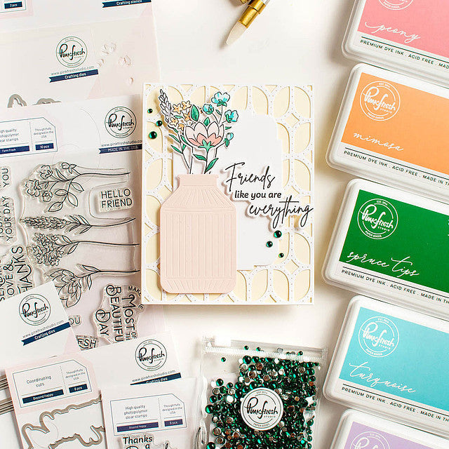 This two-piece layering stencil set is designed to pair with the Farm Fresh Stamp Set 189123 and Farm Fresh Die Set 189223. Each stencil has guidelines to help create perfect alignment when used alone. The stencils can create two layers of foliage and two layers of flowers with the same size stems. Each stencil features a line that visually separates each layer. For more depth and color, use smaller blending brushes for the stencil openings. When used with the stamped image, alignment is done directly with the stamped image, while the stencils can be used alone for a more abstract look. The stencil design measures 4.25 x 5.5 inches.