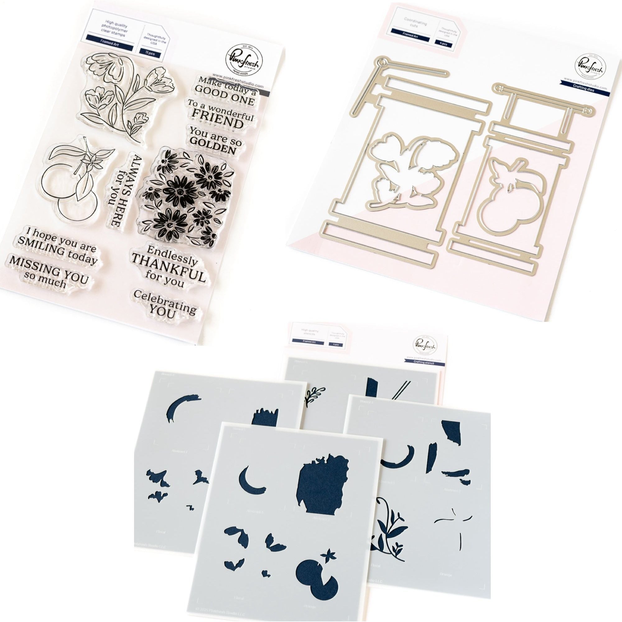 This 4 x 6 photopolymer clear stamp set with coordinating layering stencils and dies from Inna Moreva allows you to easily create modern framed art for all your paper crafting projects. The included flower and orange images align perfectly with the coordinating stencils and dies, making it easy to create beautiful backgrounds or centerpieces. The stamp set also features a flower pattern stamp for even more design options. Use your preferred coloring medium, such as watercolor, markers, or colored pencils, to add your own personal touch to the stamped images. Pinkfresh Studio products are highly versatile and offer numerous options within each design, making them a must-have for any crafting enthusiast.