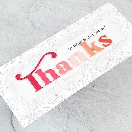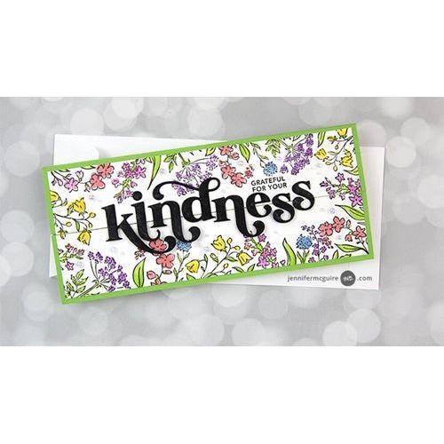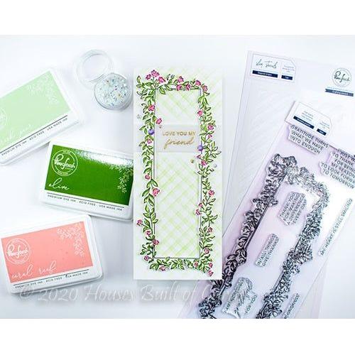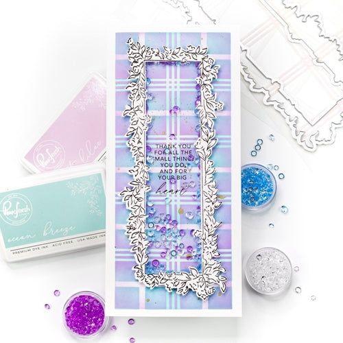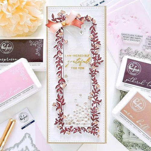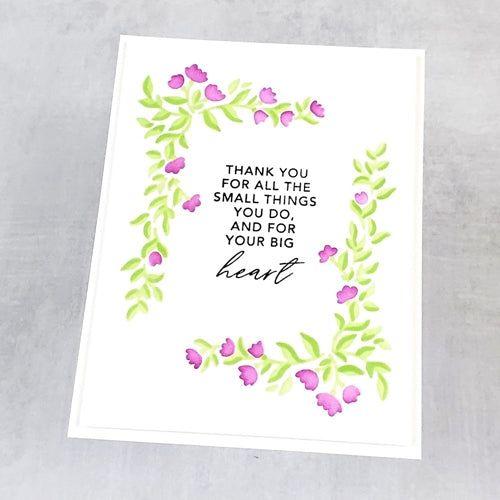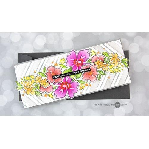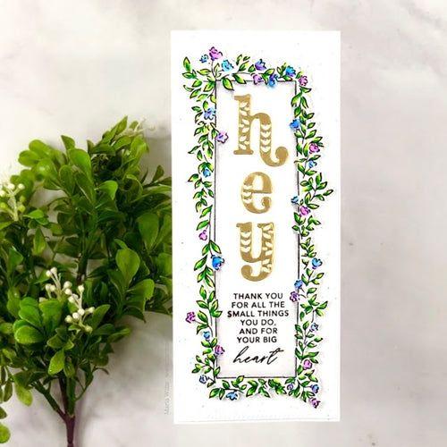 This outline floral frame, measuring 3.5 x 8 inches, fits perfectly and was designed specifically for slimline card creating! Easily ink blend the 3 different layers with the coordinating set of stencils in our premium dye inks, or color them with your favorite medium. The florals and leaves are perfect for all types of coloring; including watercolor, alcohol and brush markers, colored pencils and no-line coloring. Finish your card off with sentiments of gratitude from this gorgeous slimline stamp set!