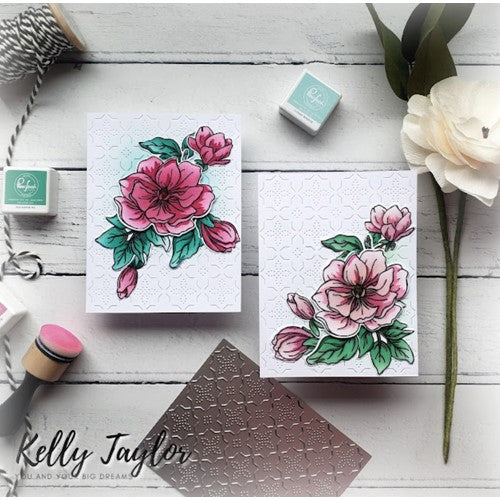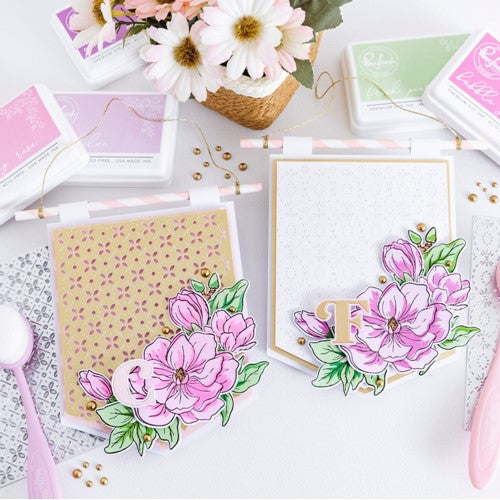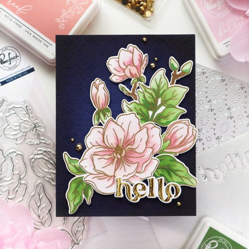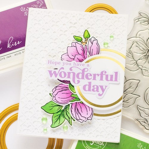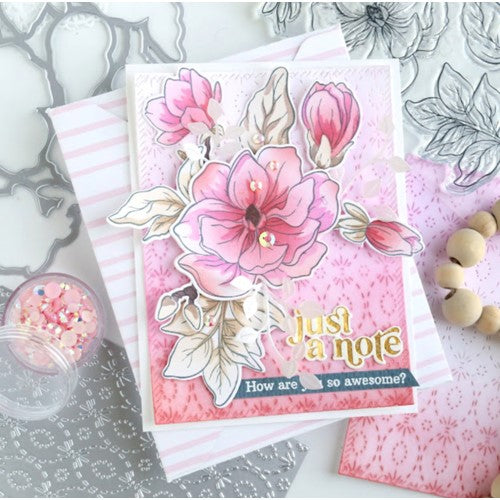 4 x 6 photopolymer clear stamp set designed by Emily Midgett. Made to coordinate with the Magnolia layering stencil set and Magnolia die. Available for purchase separately.
