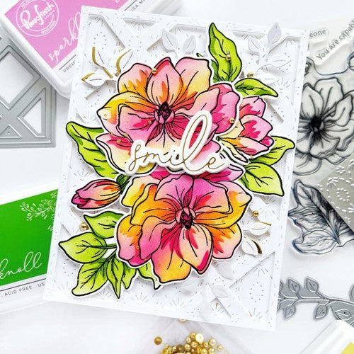 Easily ink blend color into these stunning blooms and leaves with the coordinating set of stencils, or color them with your favorite medium. You can also color the outline stamped image in your favorite mediums, including watercolor, markers and colored pencils. By offering different options within each design, you get the utmost of versatility when using PinkFresh Studio products! PinkFresh has included the florals and leaves on one stamp, so they easily align with both the layering stencil set and the 1 piece die. Finish your card off using one of the encouraging sentiments!