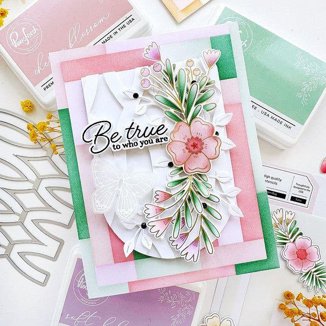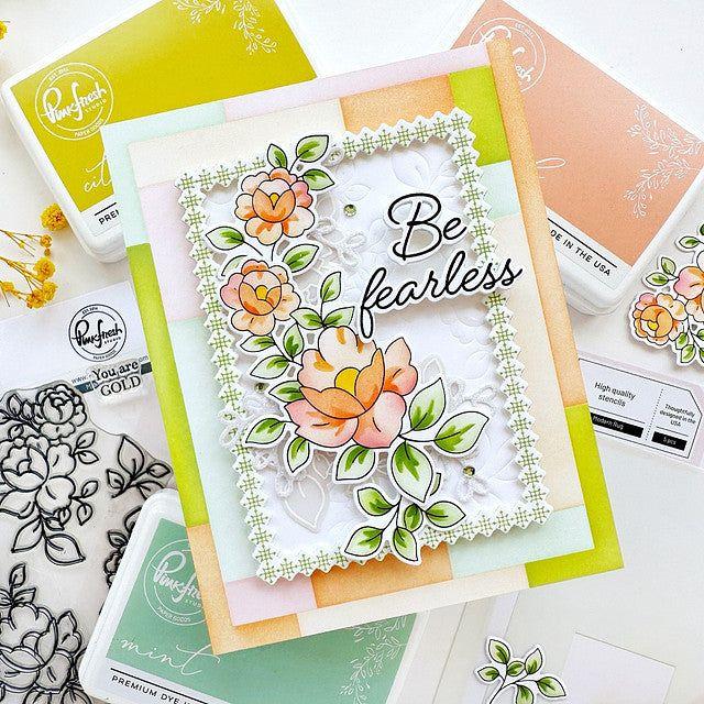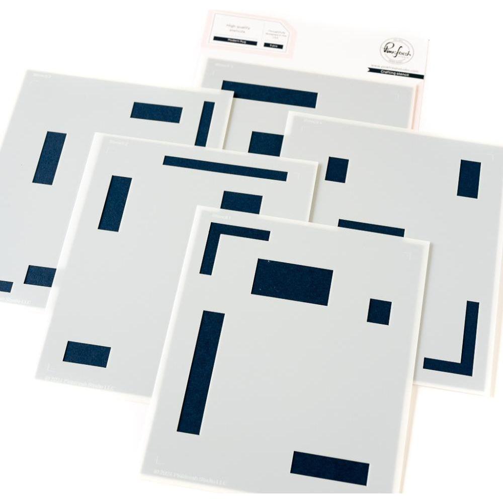 This 5-piece layering stencil set, created by Inna Moreva, allows you to effortlessly create a modern geometric background by ink blending. Add texture or shine with glitter or embossing paste and embossing ink and powder. Each layer has its own stencil with alignment guidelines for precise placement, giving you endless options for designing! Stencil design measures approximately 4.25 x 5.5 inches.