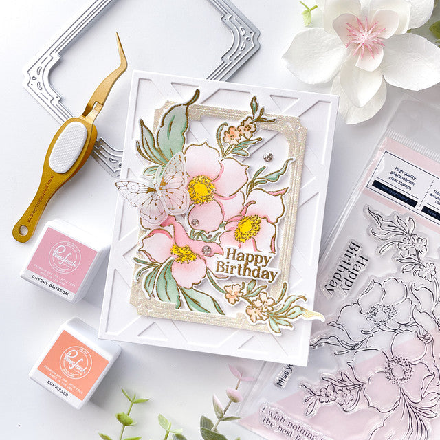 This two-piece die set works with the Nothing but the Best stamp set 190123 and layering stencil set 190323, cutting around the floral motif while leaving a thin border. Additionally, the set includes a die specifically designed to cut out the 'Happy Birthday' sentiment.