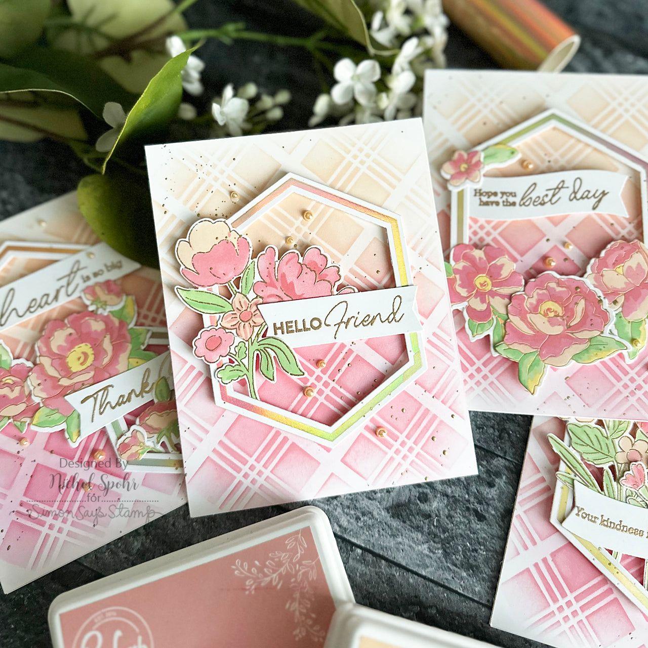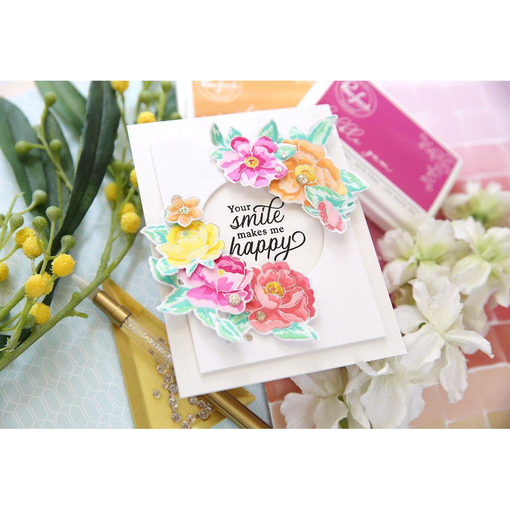 For further customization and added dimension, the Peony Fantasy layering stencil set can be combined with the hot foiled designs. This coordination enables you to effortlessly ink blend the flowers and leaves using PinkFresh Studio's premium dye inks. With a wide array of 48 shades available, you have the freedom to explore a diverse range of color combinations, resulting in vibrant and captivating floral arrangements.