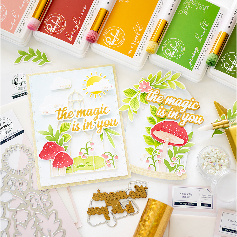 These fresh and fun summer elements fit perfectly within an A2 sized card stock panel. With a stencil for every layer and guidelines for perfect alignment, easily ink blend all the summer blooms with PinkFresh Studio's 48 shades of premium dye ink. Add dimension to a layer with texture or glitter paste, or add some shine with embossing ink and powder. Once cut out, these adorable images pair perfectly with our Gazebo die for creating a lovely summer scene.