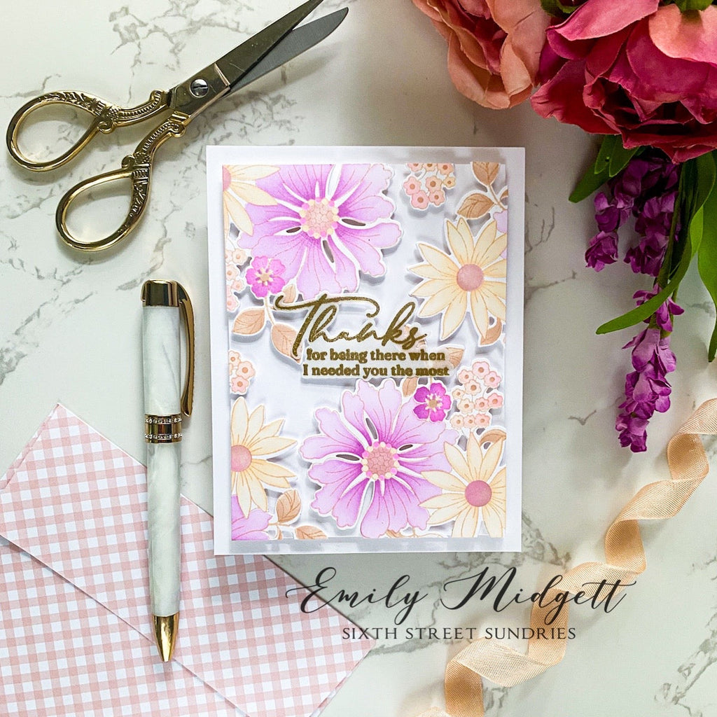 This 6 piece layering stencil set is specially curated to coordinate with the Thanks for Being There stamp set and die set. Each stencil comes with alignment guides for perfectly arranged stencils when used solo, or you can match each layer to stamped images for a more detailed look. Stencil size is roughly 4.25 x 5.5 inches and can be further embellished by stamping with detail black or heat embossing with your favorite powder for added shimmer.