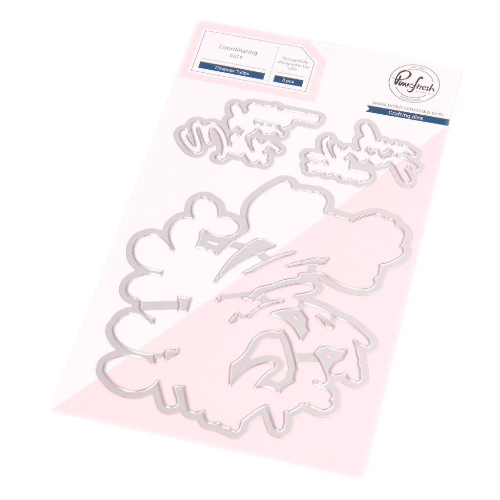 This die set from Pinkfresh Studio, designed by Whitedaisy by Miza, features a coordinating die that cuts out gorgeous tulips. There is a hidden magnet within the packaging to keep the multiple pieces of the die in place. The set includes 3 pieces and the approximate measurement of the main image is 3.5 x 4.5 inches. Made of high-quality steel, the packaging also includes a finished, full-color example.