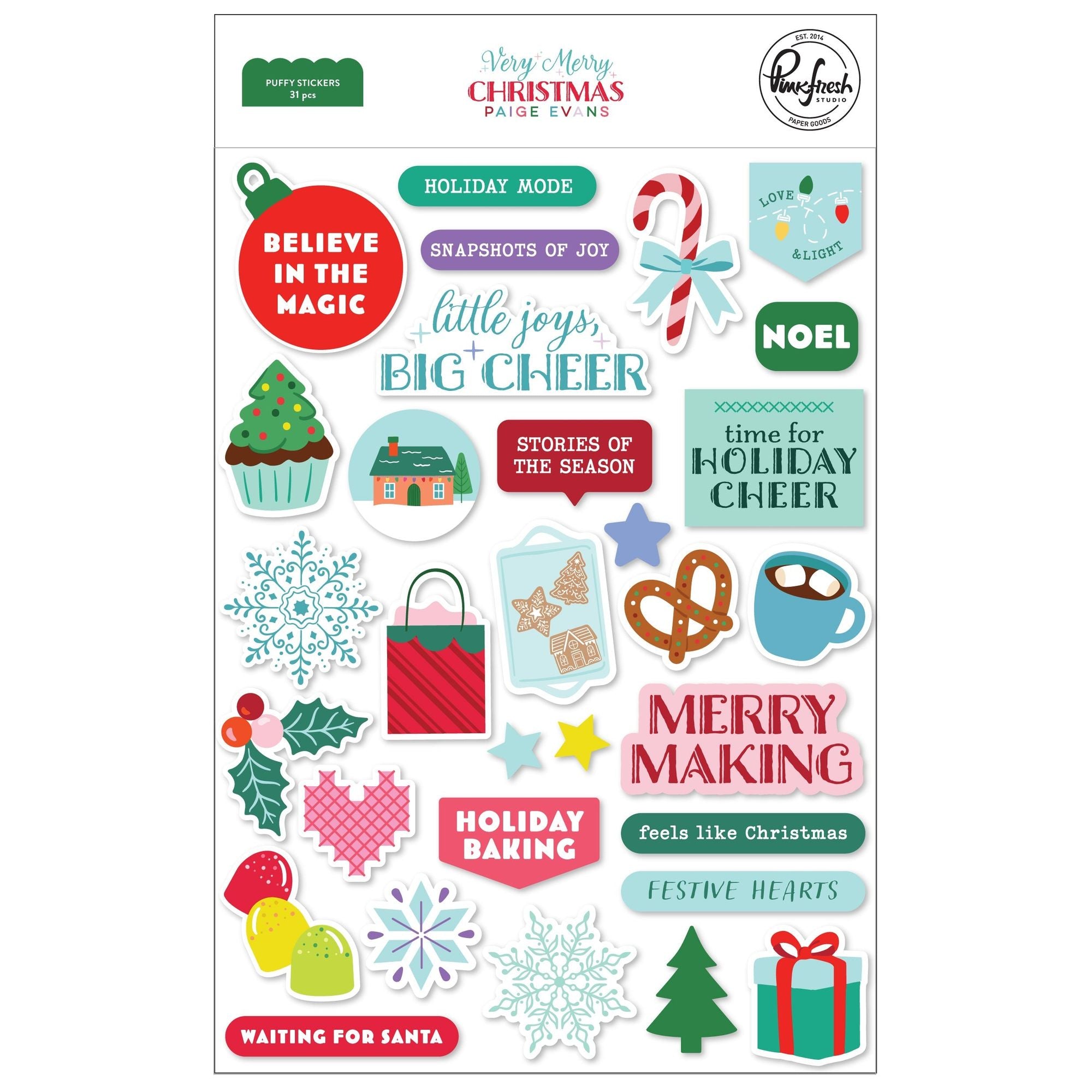 Pinkfresh Studio Very Merry Christmas Puffy Stickers deliver a festive burst of fun with 31 puffy pieces on a 5 x 7 inch sheet. Enjoy delightful images like ornaments, cupcake trees, candy canes with bows, hot cocoa, gingerbread cookies, holiday lights, and more—all made with archival quality, acid-free materials to brighten up your holiday crafts!