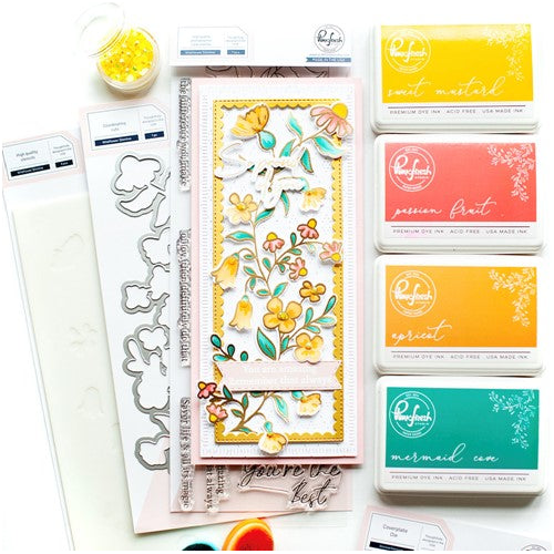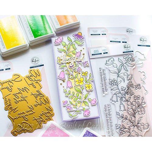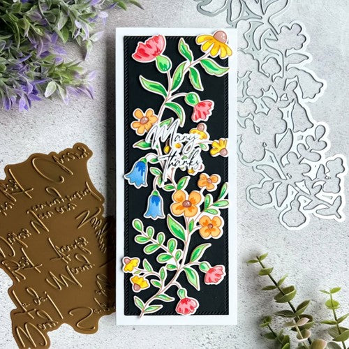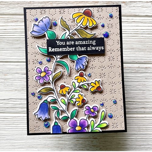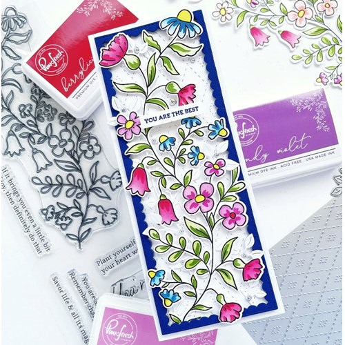 These whimsical wildflowers are perfectly designed for slimline cards, but can truly be used on any size by trimming them here and there! Easily ink blend colors to the flowers and leaves with the coordinating stencils in all your favorite shades of ink. You can also color the outline stamped image in your favorite mediums, including watercolor, markers and colored pencils. By offering different options within each design, you get the utmost of versatility when using PinkFresh Studio products!