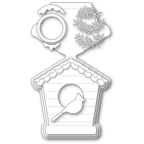 Dies are approximately 4.3 x 7.4 inches easel, 4.1 x 4.3 inches background, 3.9 x 4 inches birdhouse, 4 x 1.3, 3.9 x 1.5 inches roofs, 1.4 x 0.9, 1.6 x 0.9, 1.7 x 0.9 inch pines, 1.9 x 1.6 inches cardinal, 1.6 x 1.6 inches hole, 1.5 x 0.5, 0.9 x 0.5 inch snow.