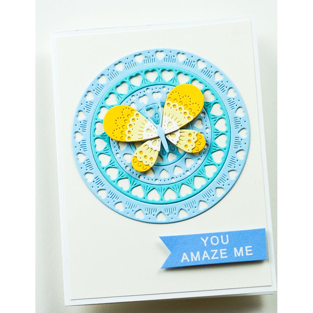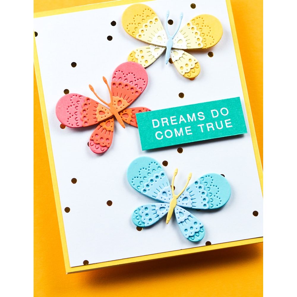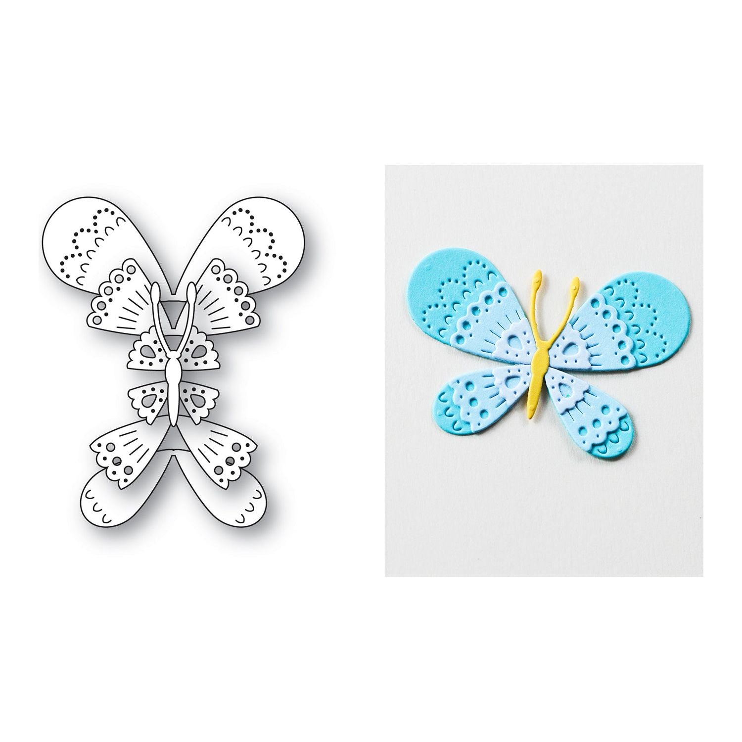 The Poppy Stamps Nordic Belle Butterfly Dies, part of the Nordic Spring Collection, add a delicate and elegant touch to your crafting projects. Crafted from durable steel, these wafer-thin dies are compatible with most die-cutting machines and cut through materials such as cardstock, felt, fabric, and shrink plastic. Perfect for cutting, stenciling, and embossing, they bring intricate detail to your designs. This set includes two dies that cut seven pieces, assembling into a beautifully layered butterfly with intricate Scandi-inspired patterns. The finished design measures approximately 2.1 x 1.4 inches. Adjust the wing layers to create added texture and dimension, making it perfect for cards, scrapbook pages, and decorative embellishments.