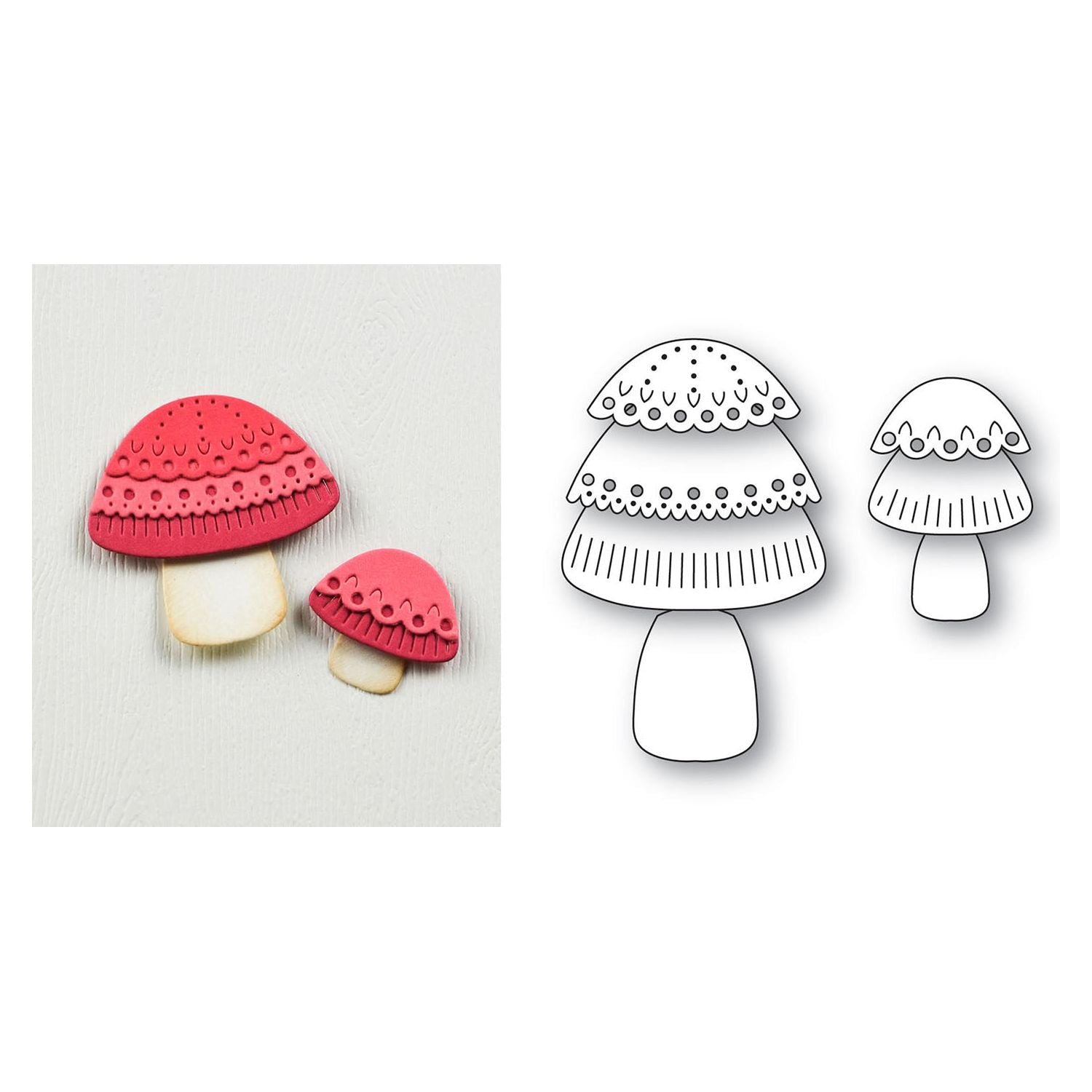 The Poppy Stamps Nordic Button Mushrooms Dies, part of the Nordic Forest Collection, are crafted from durable steel and compatible with most die-cutting machines. These versatile dies cut cleanly through cardstock, felt, fabric, and shrink plastic, and can also be used for stenciling and embossing. The set includes two dies that cut 7 individual pieces to create two charming mushrooms with Scandinavian-inspired patterns on their caps. Assembled mushrooms measure approximately 1.6 x 1.7 inches and 1 x 0.9 inches. Coordinates well with Nordic Swirl Mushrooms 2720 and Nordic Long Stem Mushrooms 2725 dies.