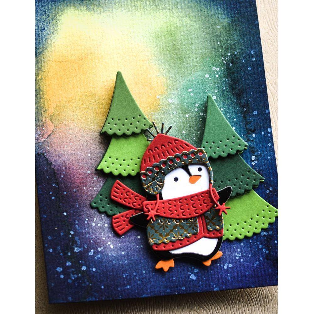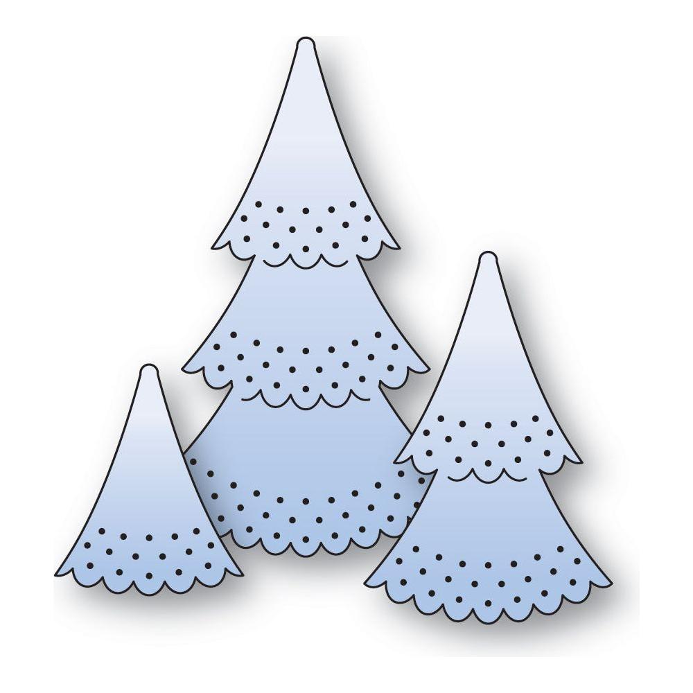 Poppy Stamps Nordic Dimple Trees Dies are part of the Nordic Wonderland Collection. Crafted from durable steel and are compatible with nearly every machine available on the market. These versatile dies can be used on various materials, including cardstock, felt, fabric, or shrink plastic, giving you the ability to cut, stencil, emboss, and bring your creative ideas to life. The set includes one wafer-thin die that cuts out three distinct tree designs, measuring approximately 1.5 x 2.5 inches, 1.2 x 1.8 inches, and 0.9 x 1.1 inches. For added dimension, complement your designs with the Nordic Dimpled Tree Toppers 2629.