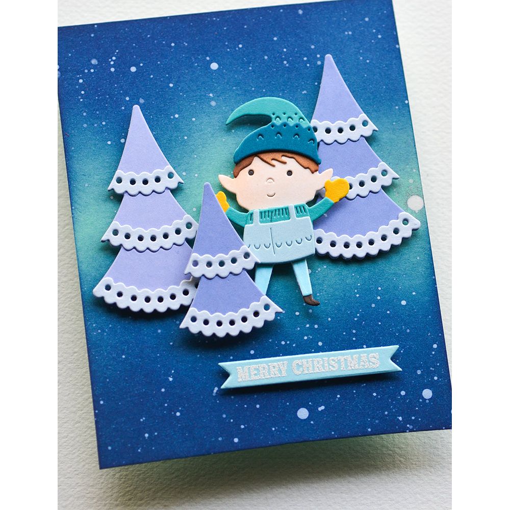 The Poppy Stamps Nordic Joyful Elf Dies from the Nordic Winter Collection are made from durable steel and are compatible with nearly all die-cutting machines. These versatile dies can be used on materials such as cardstock, felt, fabric, or shrink plastic, allowing you to cut, stencil, emboss, and create with ease. This wafer-thin die set includes one die that cuts out 15 designs. The assembled elf measures approximately 1.7 x 2.2 inches, with a 1.1 x 0.9 inch layered hat. The elf is dressed in a jumpsuit with Norwegian patterns, and you can position his arms to have him waving, with both hands in the air, or with his hands behind his back. This set pairs well with the Nordic Sweet Elf Dies 2641 for coordinated designs.