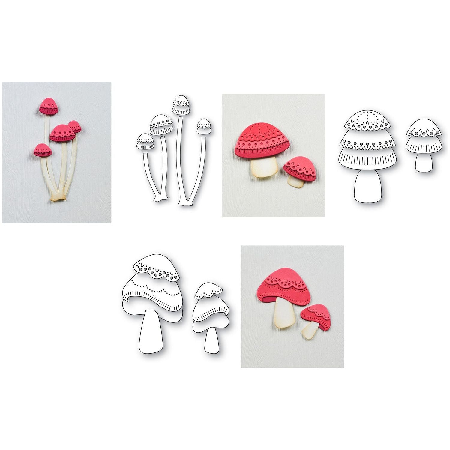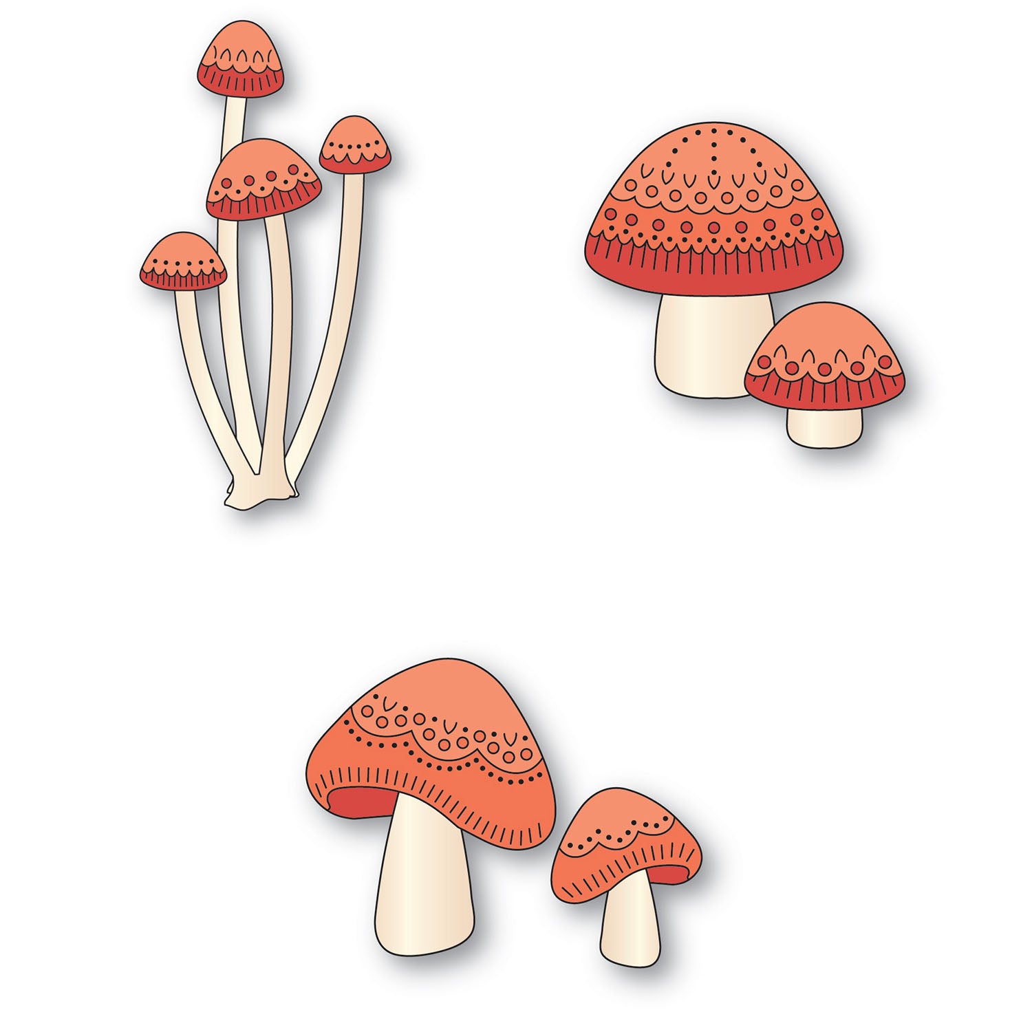 Nordic Long Stem Mushrooms Dies (2725) – This set includes two dies that cut 10 individual pieces to create a cluster of four tall mushrooms with Scandinavian-inspired patterned caps. Assembled mushrooms measure approximately 1 x 3.1 inches and 1.3 x 2.6 inches.