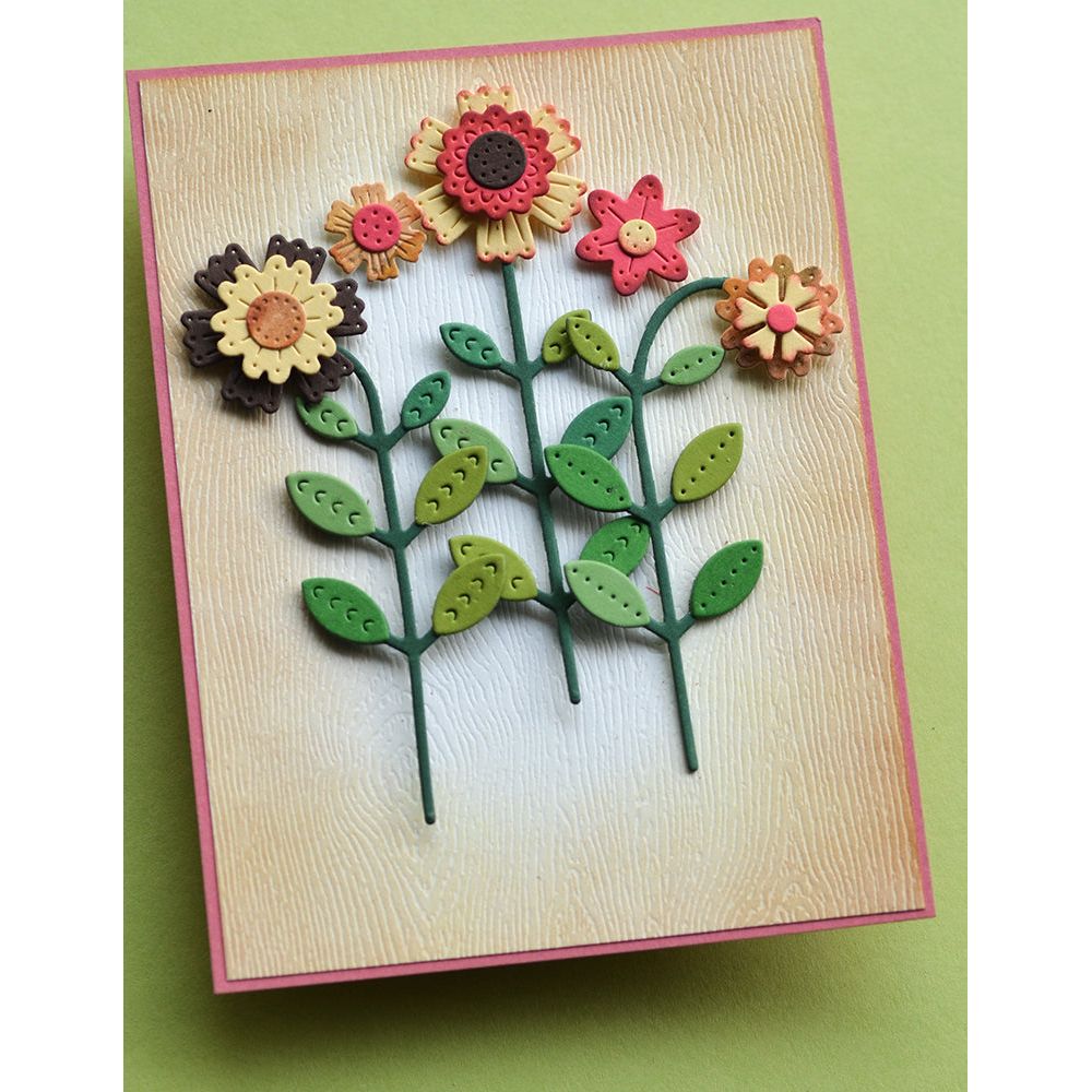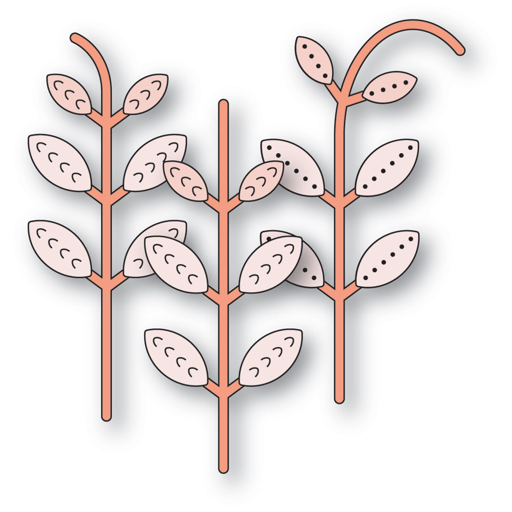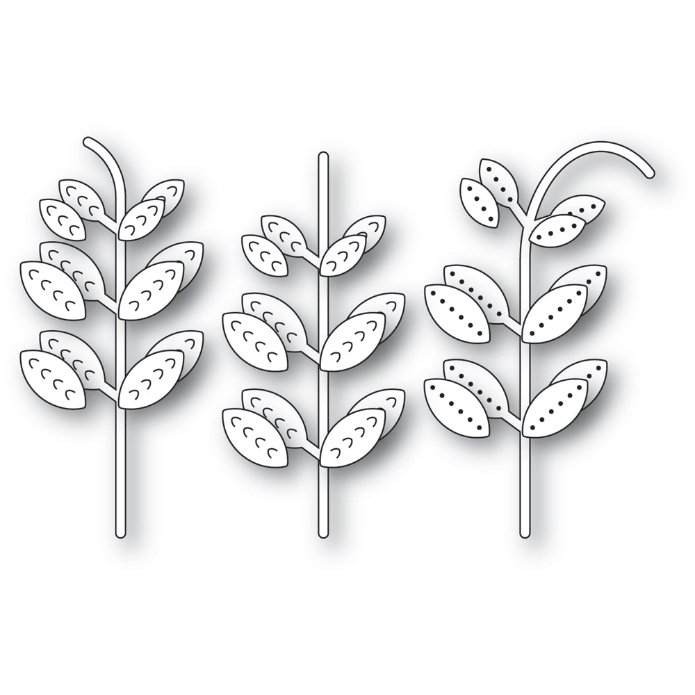 The Poppy Stamps Nordic Stems Dies from the Nordic Winter Collection are made from durable steel and compatible with nearly all die-cutting machines. These versatile dies can be used on materials like cardstock, felt, fabric, or shrink plastic, allowing you to cut, stencil, emboss, and create with ease. This wafer-thin die set includes two dies that cut out 23 designs, detabbed and mounted on a magnetic sheet. The leafy stems measure approximately 1.5 x 2.8, 1.2 x 2.9, and 1.2 x 2.7 inches. These stems are perfect for pairing with Nordic blooms to create beautiful floral arrangements in your projects.