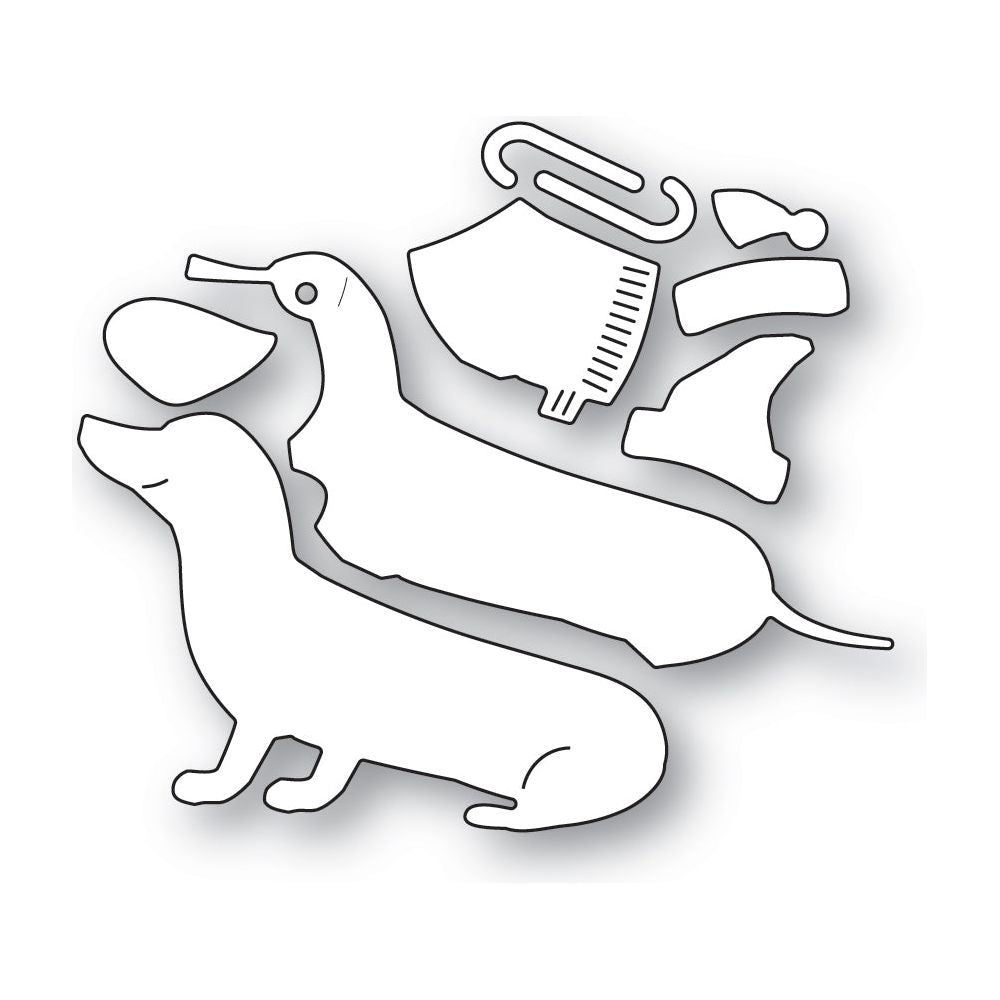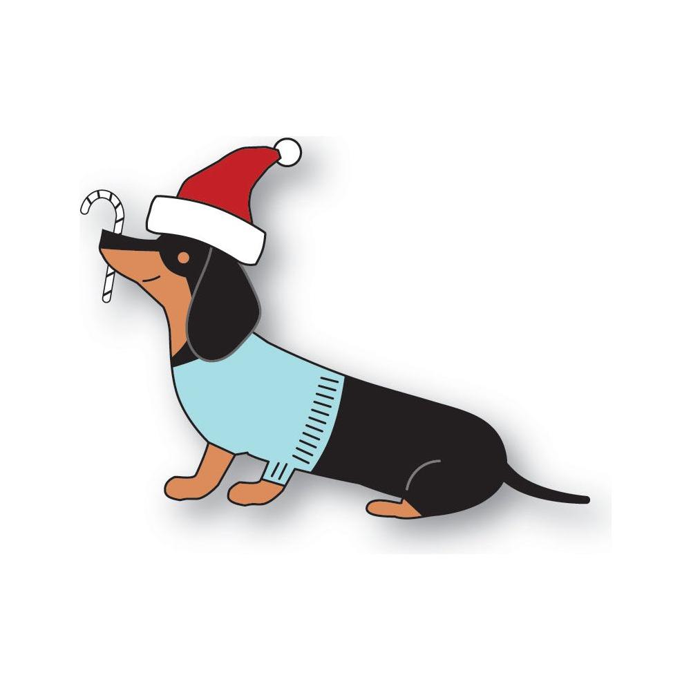 The Poppy Stamps Sitting Dachshund Dies from the Nordic Winter Collection are made from durable steel and compatible with nearly all die-cutting machines. These versatile dies can be used on materials like cardstock, felt, fabric, or shrink plastic, allowing you to cut, stencil, emboss, and create with ease. This wafer-thin die set includes two dies that cut out nine designs, detabbed and mounted on a magnetic sheet. When assembled, the sitting dachshund measures approximately 2.5 x 1.8 inches and is ready for the holidays with his Santa hat, candy cane, and sweater. It works well with the Antler Dachshund Dies 2651, Standing Dachshund Dies 2653, Furry and Bright Dies 2654, Believe in Santa Paws Dies 2656, and Happy Howlidays Dies 2666 for coordinating projects.