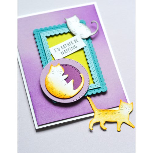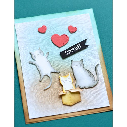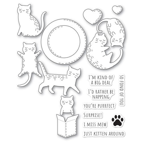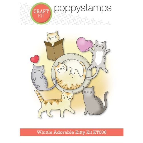 Poppy Stamps dies are made of durable steel and usable in nearly every machine on the market! Use on cardstock, felt, fabric or shrink plastic. Cut, stencil, emboss and create! 5 dies included, cuts out 10 designs. detabbed and mounted on a magnetic sheet. 8 clear stamps included. Approximately 2.3 x 1.6, 1.4 x 1.6, 1.3 x 2.1, 1.7 x 1.5, 1.6 x 1.2, 0.6 x 0.9 inch kitties, 1.1 x 1.1 inches box, 2.2 x 2.2 inches bed, 0.9 x 0.7, 0.5 x 0.4 inch hearts.