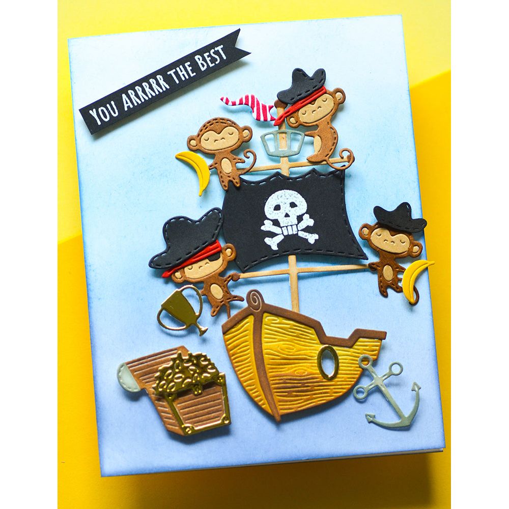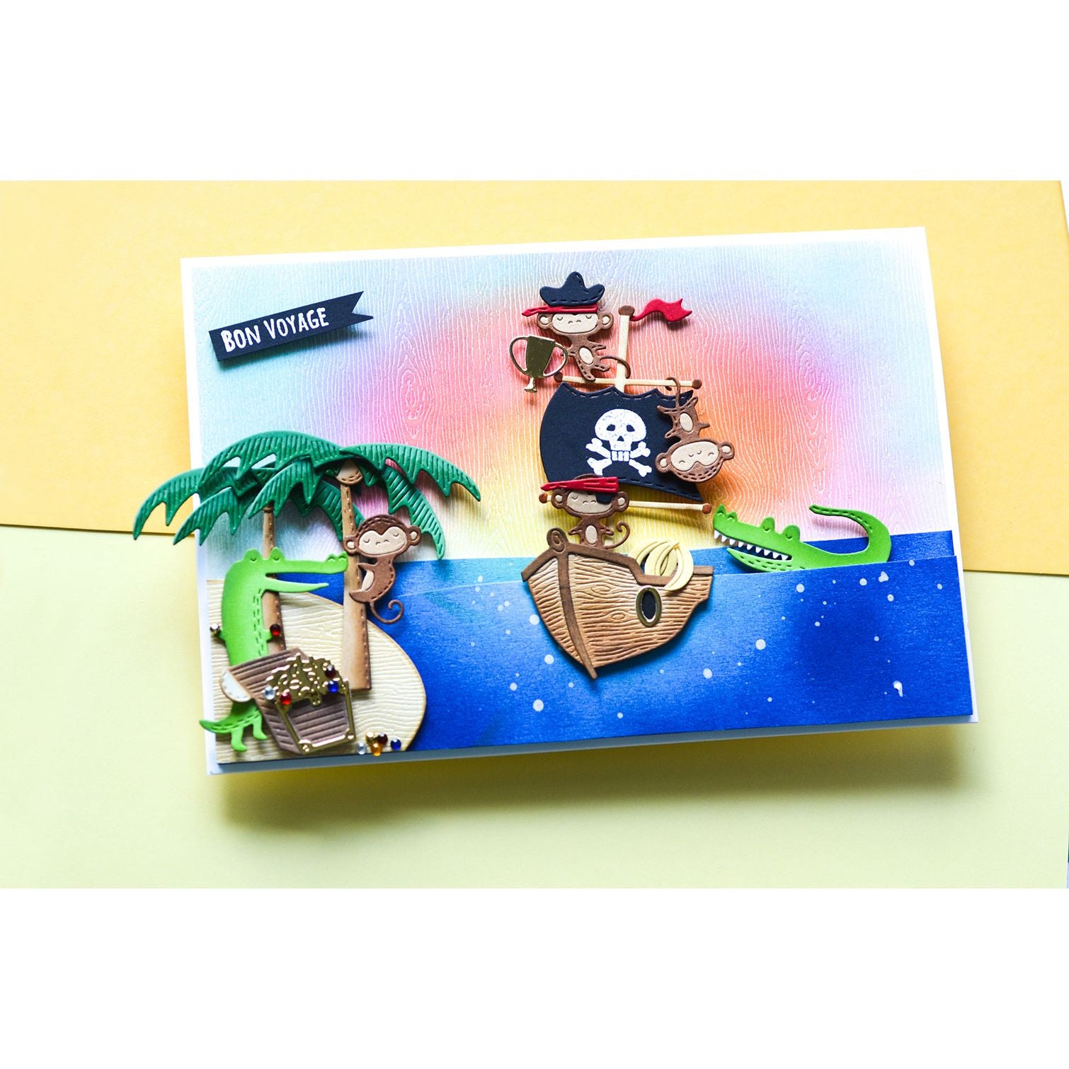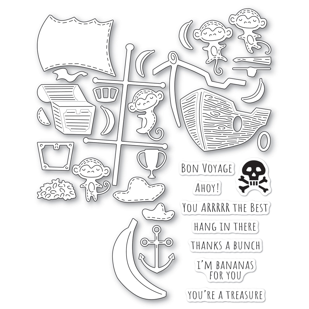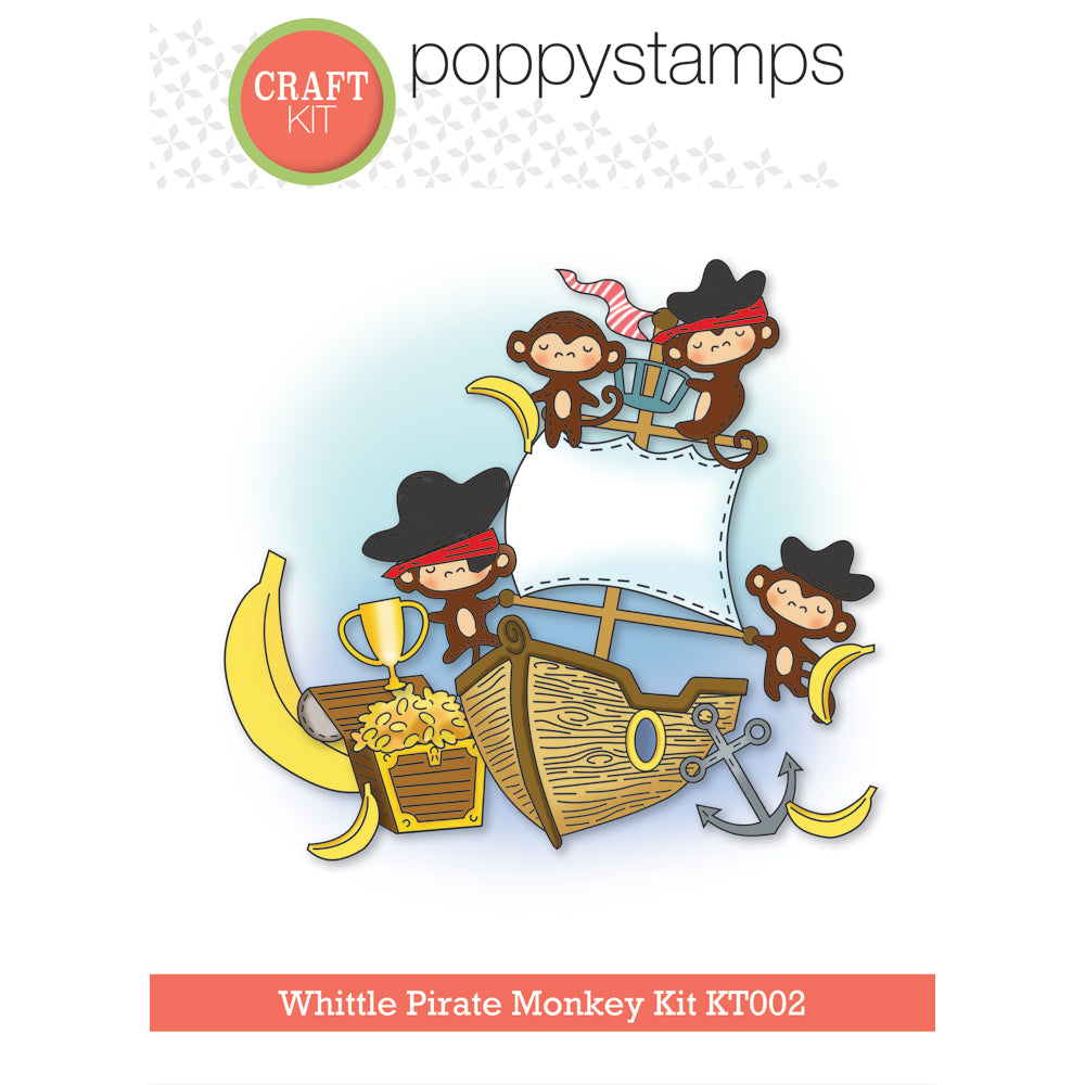 The Poppy Stamps Whittle Pirate Monkey Stamp and Die Kit is perfect for adding a touch of swashbuckling fun to your projects. With 7 dies cutting out a total of 26 designs, plus clear stamps, this kit provides everything you need to create playful scenes featuring charming pirate monkeys and nautical elements. Among the die designs are a wooden pirate ship complete with mast, sail, flag, porthole, and crow’s nest, along with four delightful monkeys, bananas, a trophy, a treasure chest brimming with gold, bandanas, hats, and an anchor. Complementing the dies are 8 clear stamps featuring a skull and crossbones motif and a variety of sentiments, including "Bon Voyage," "Ahoy," "You Arrrrr the best," "Hang in there," "Thanks a Bunch," "I’m Bananas for you," and "You’re a treasure." With dimensions ranging from approximately 0.8 x 1.1 inches for the monkeys to 2.1 x 3.9 inches for the assembled ship, this kit offers versatility in size, enabling you to customize your designs to suit your crafting needs. Dies are made of durable steel and usable in nearly every machine on the market! Use on cardstock, felt, fabric or shrink plastic. Cut, stencil, emboss and create!