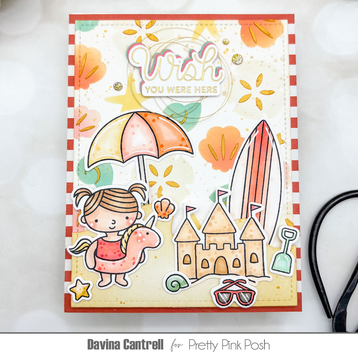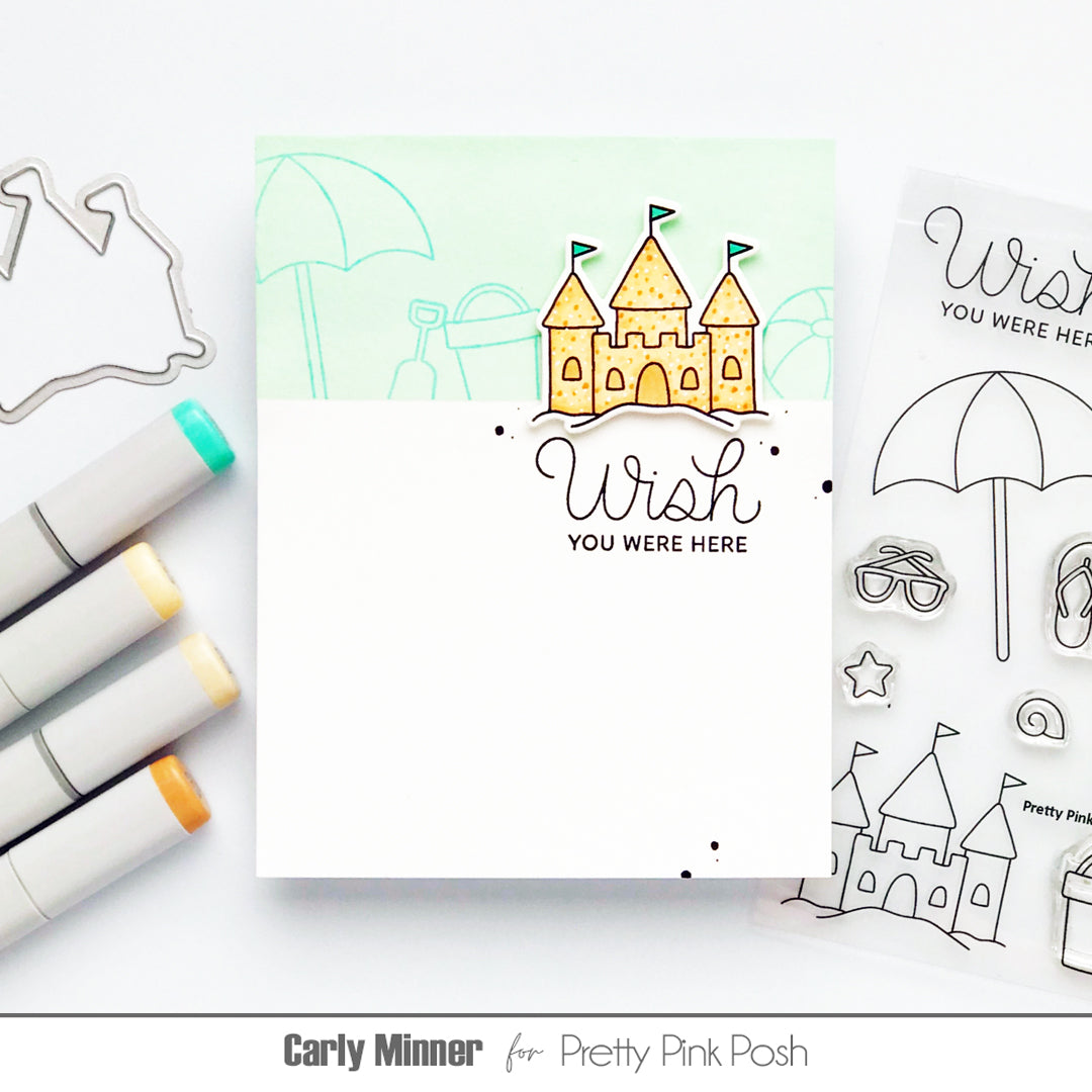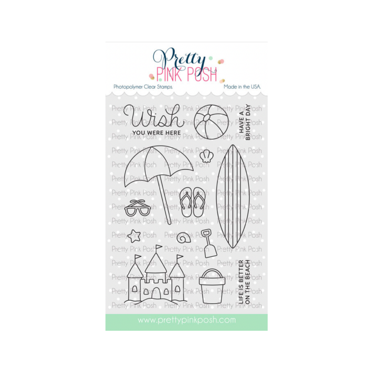 The Pretty Pink Posh Beach Fun Clear Stamps is a 4 x 6 inch clear stamp set featuring 14 beach-day essentials, including an umbrella, beach ball, sandcastle, bucket, shovel, shells, sunglasses, flip flops, and three coordinating sentiments.