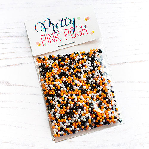 Add a touch of flair and texture to your craft projects with the Pretty Pink Posh Classic Halloween Glass Shaker Beads. This festive mix includes tiny shaker beads in orange, black, and white, making them perfect for creating shaker cards. Each pack contains 2 teaspoons of 2mm beads. Please note, these are not edible and are not suitable for young children.