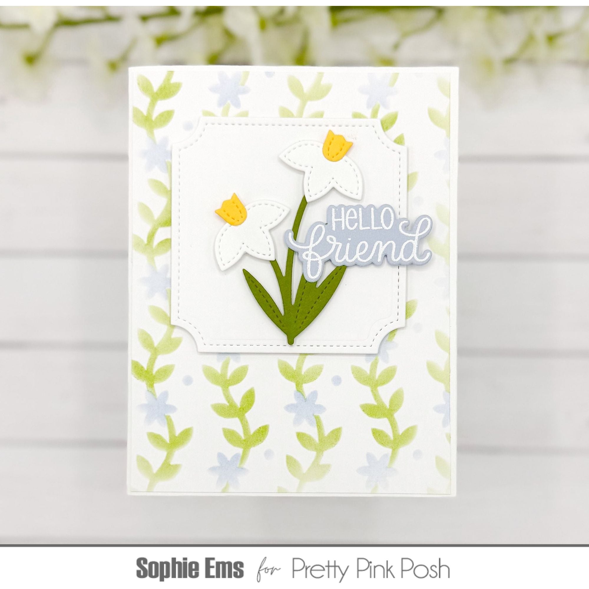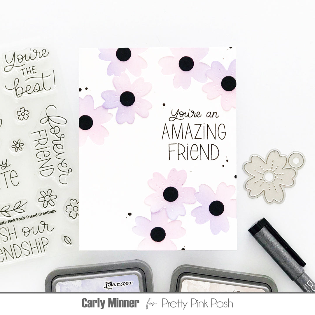 Pretty Pink Posh Friend Greetings Clear Stamps is a 4x6 inch stamp set featuring 13 designs, including 6 heartfelt sentiments and a variety of playful floral accents. Perfect for adding a cheerful touch to cards, tags, and other paper crafts. Coordinating Friend Greetings Dies are sold separately. Stamps are made in the USA.