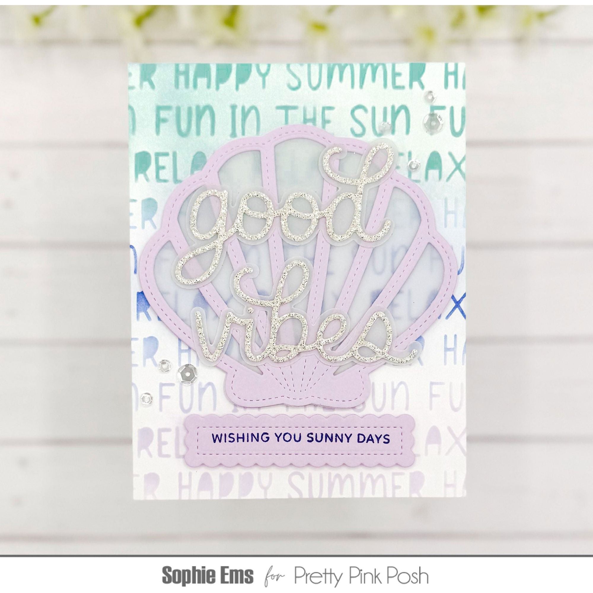 The Pretty Pink Posh Good Vibes Shadow Dies set includes 4 high-quality steel dies: two script font words, good and vibes, along with their matching shadow outlines. Perfect for adding stylish detail to cards, scrapbooking, and other paper crafts.