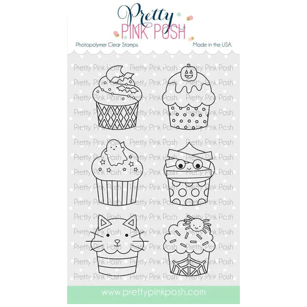 Designed and manufactured in the USA, these clear stamps ensure top-notch quality for all your crafting needs. The images in this stamp set feature 6 fun Halloween-themed cupcakes adorned with various decorations, including bats, a jack-o'-lantern, a ghost, a mummy, a cat, and a spider.