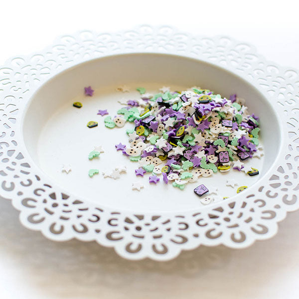 Pretty Pink Posh Halloween Friends Clay Confetti is a playful mix of tiny polymer shapes, including monsters, vampires, ghosts, bats, and stars. Perfect for adding a whimsical, spooky touch to your craft projects.