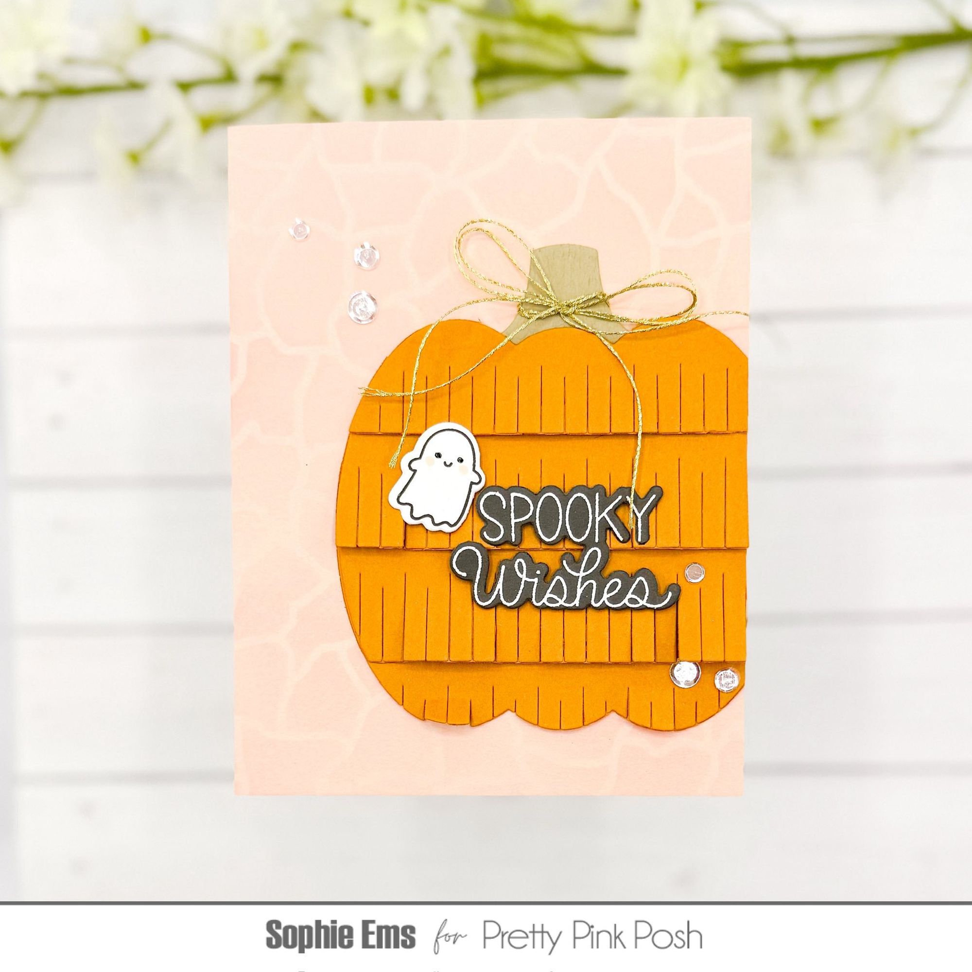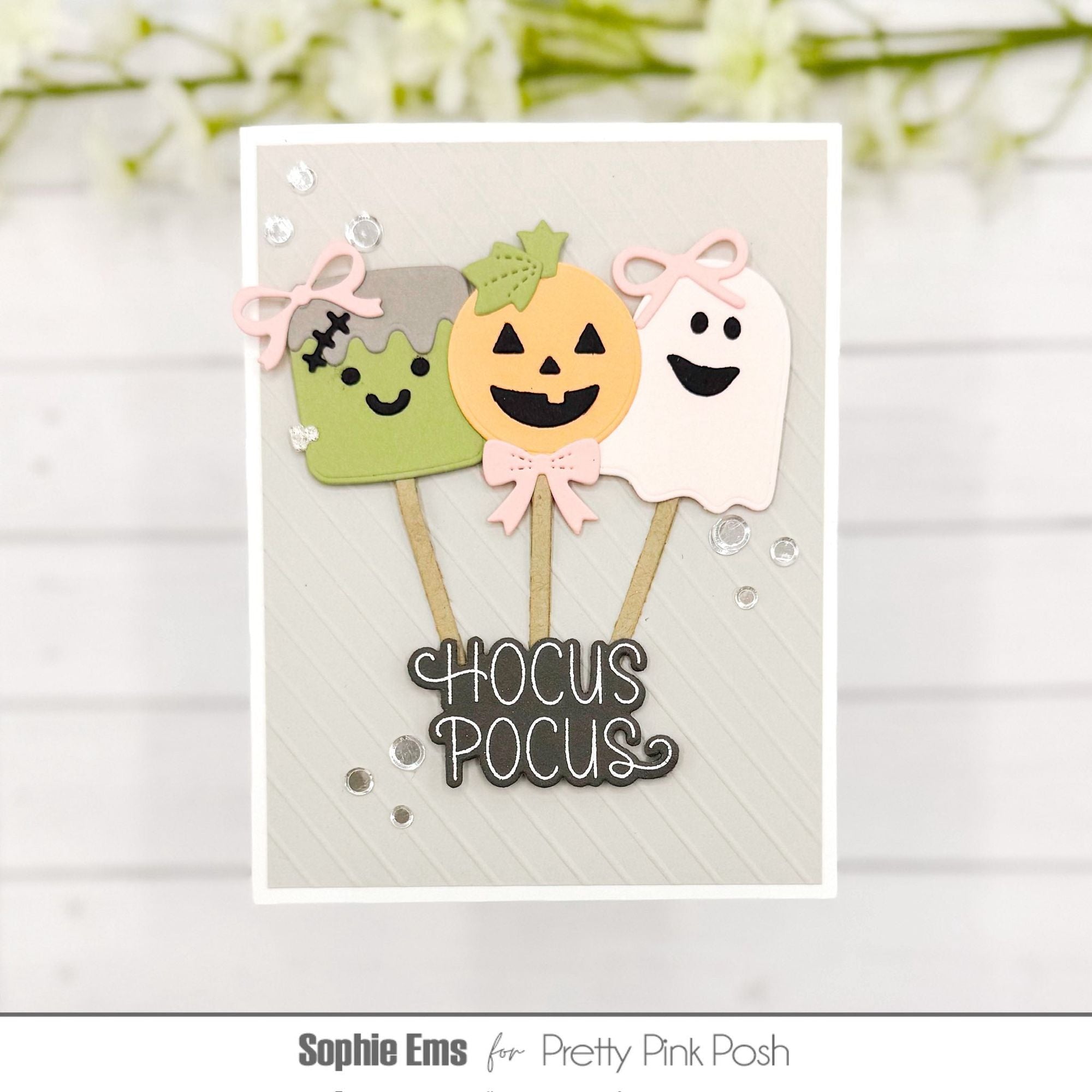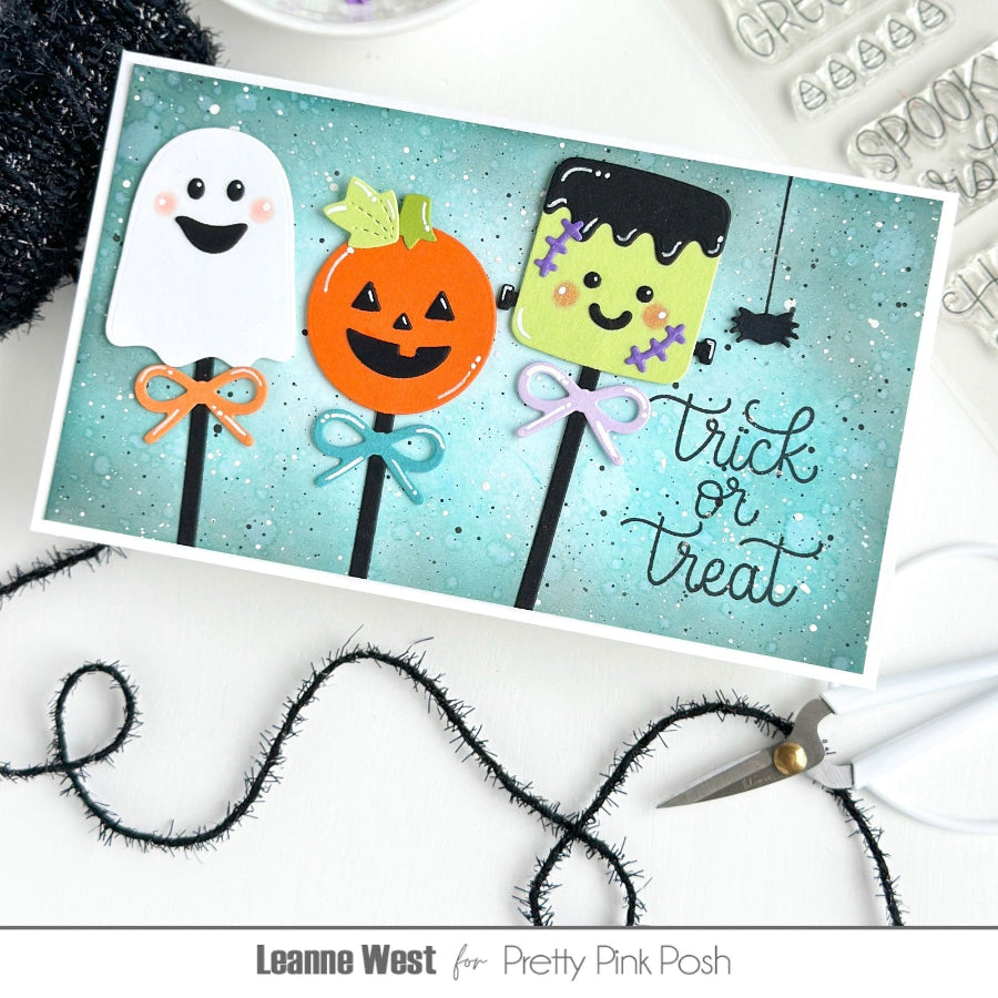Pretty Pink Posh Halloween Greetings Clear Stamps is a 4x6 inch set featuring 8 sentiments along with candy corn, a ghost, a spider, bats, and sparkle accents.