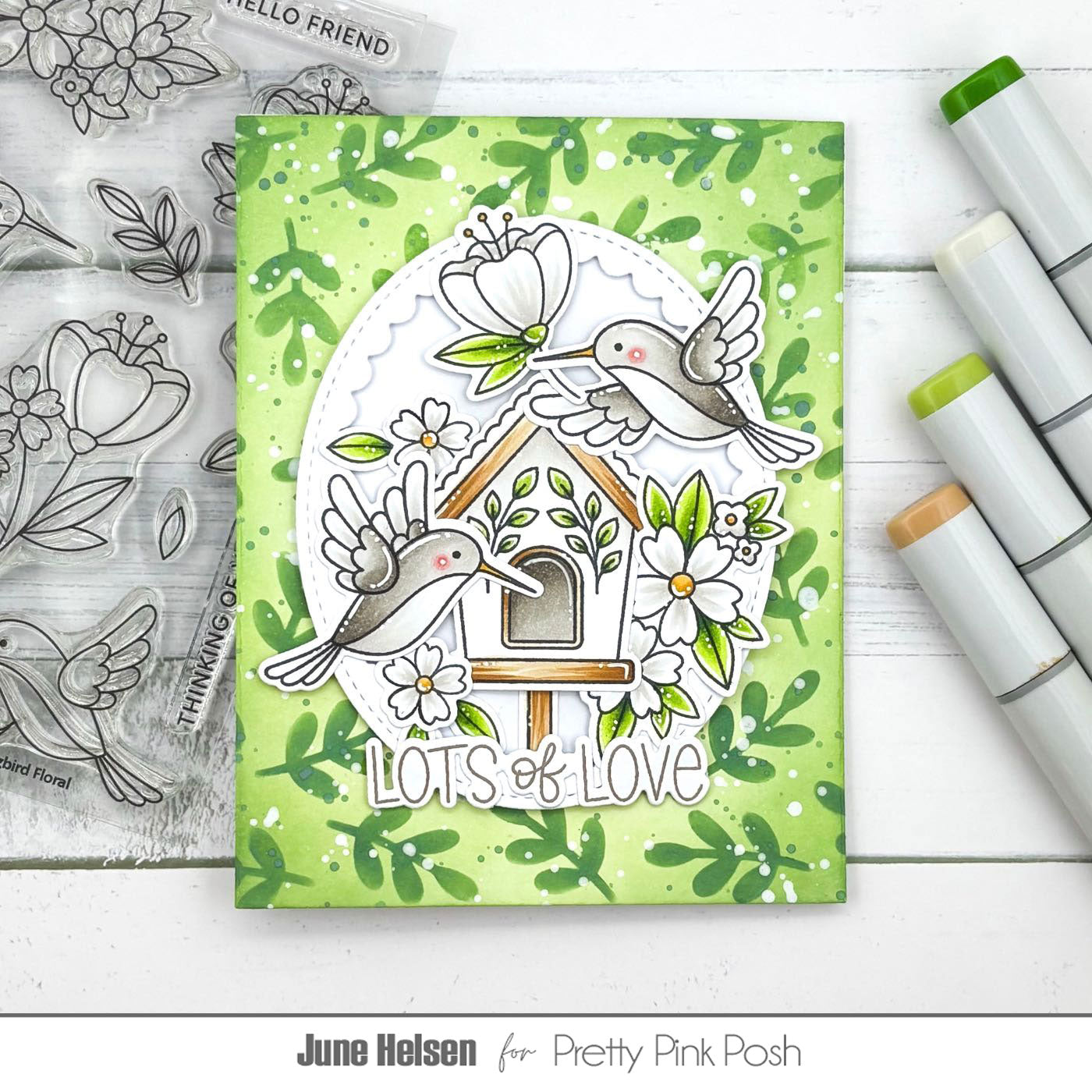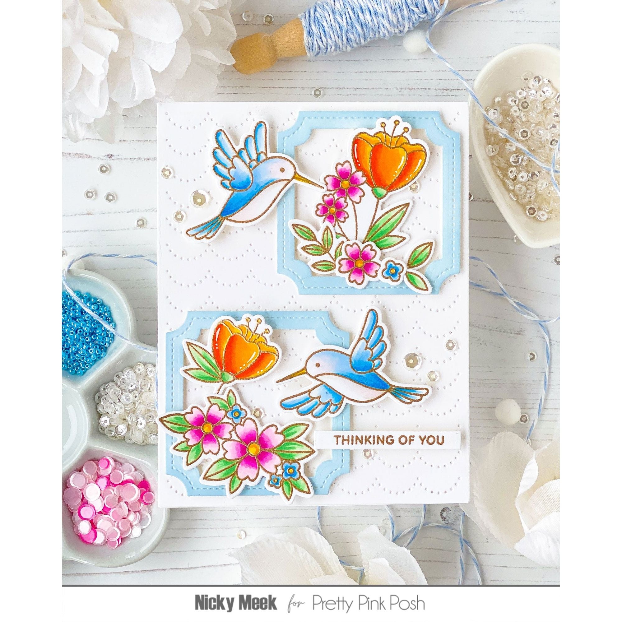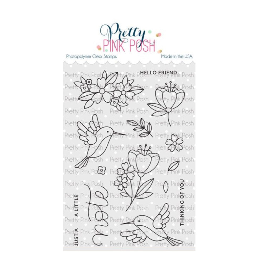 Pretty Pink Posh Hummingbird Floral Clear Stamps is a 4x6 inch set filled with charming images, including two adorable hummingbirds, floral elements, and coordinating sentiments. With 15 designs in total, it's perfect for creating whimsical and uplifting paper crafts. Coordinating Hummingbird Floral Dies are sold separately.