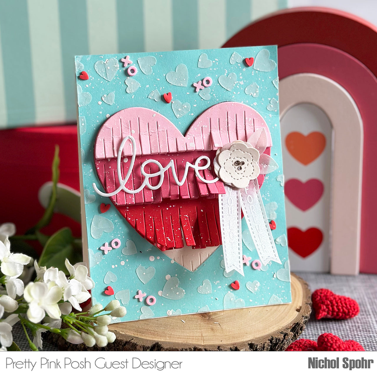 The Pretty Pink Posh Scattered Hearts Frame Stencil is a charming 6x6 inch single stencil featuring a large heart surrounded by a frame of smaller hearts. There is also a fun scalloped border on one side. Simply place the stencil over your project area and secure it with washi tape or repositionable adhesive. Use it with inks, embossing paste, sprays, or other mediums to create beautiful, heart-filled patterns and textures. Perfect for Valentine's Day, love-themed projects, or any occasion, this stencil is made in the USA.