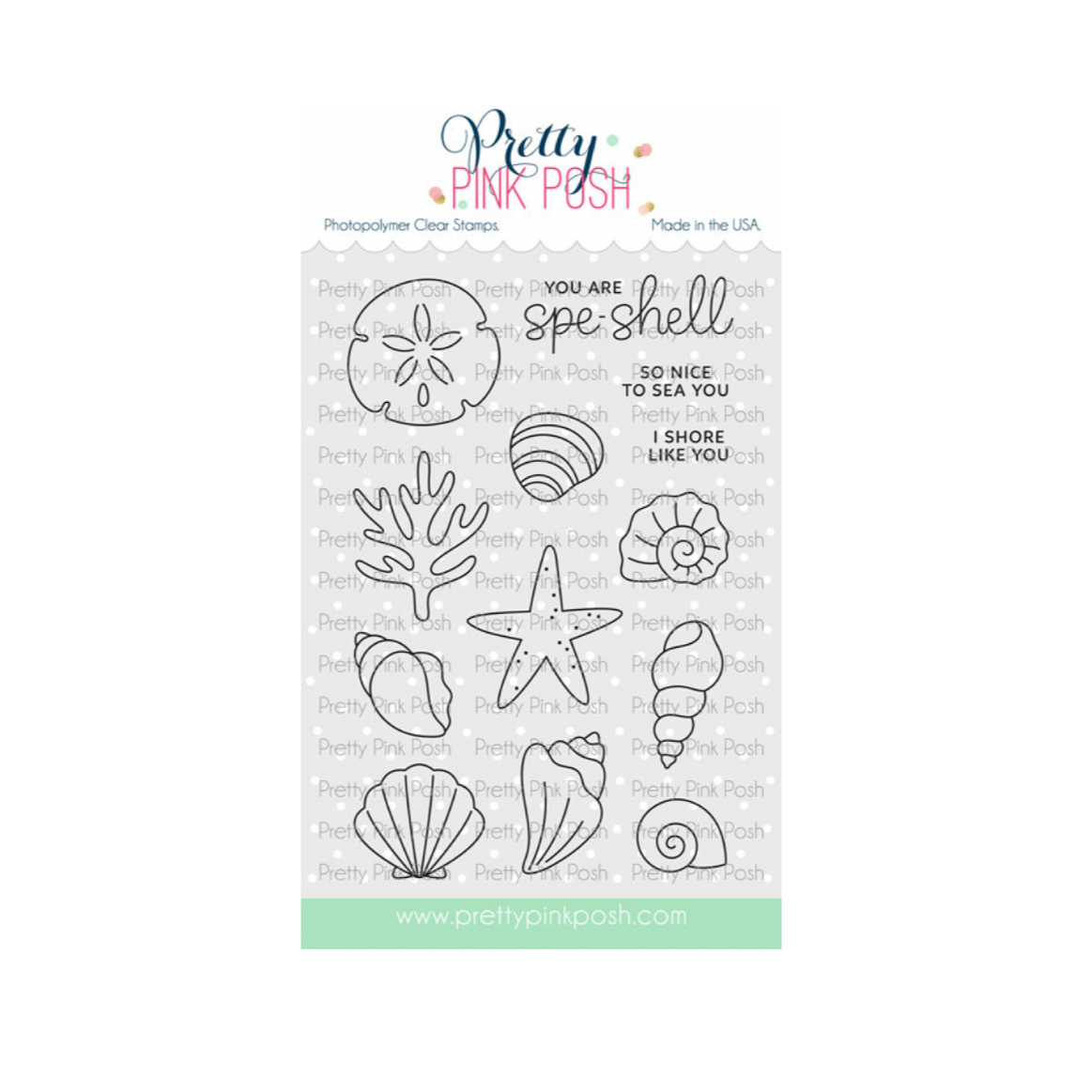 The Pretty Pink Posh Seashells Clear Stamps is a 4 x 6 inch clear stamp set featuring 13 beach-themed designs, including a variety of seashells, sand dollars, and three coordinating sentiments. Perfect for summer and ocean inspired projects. Made in the USA.